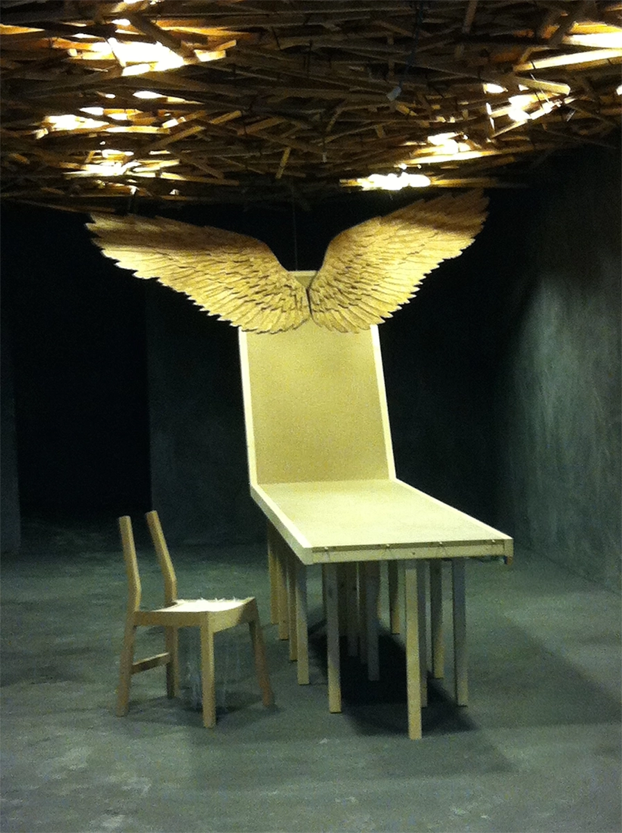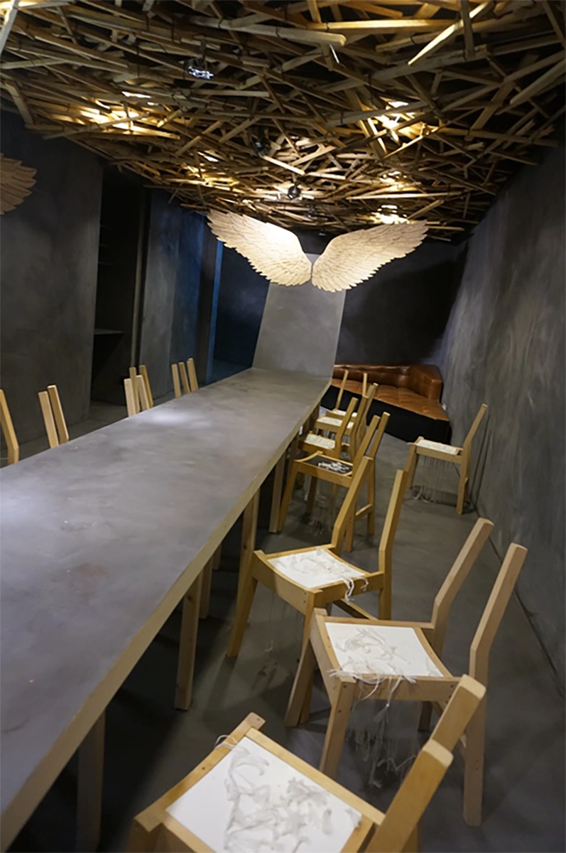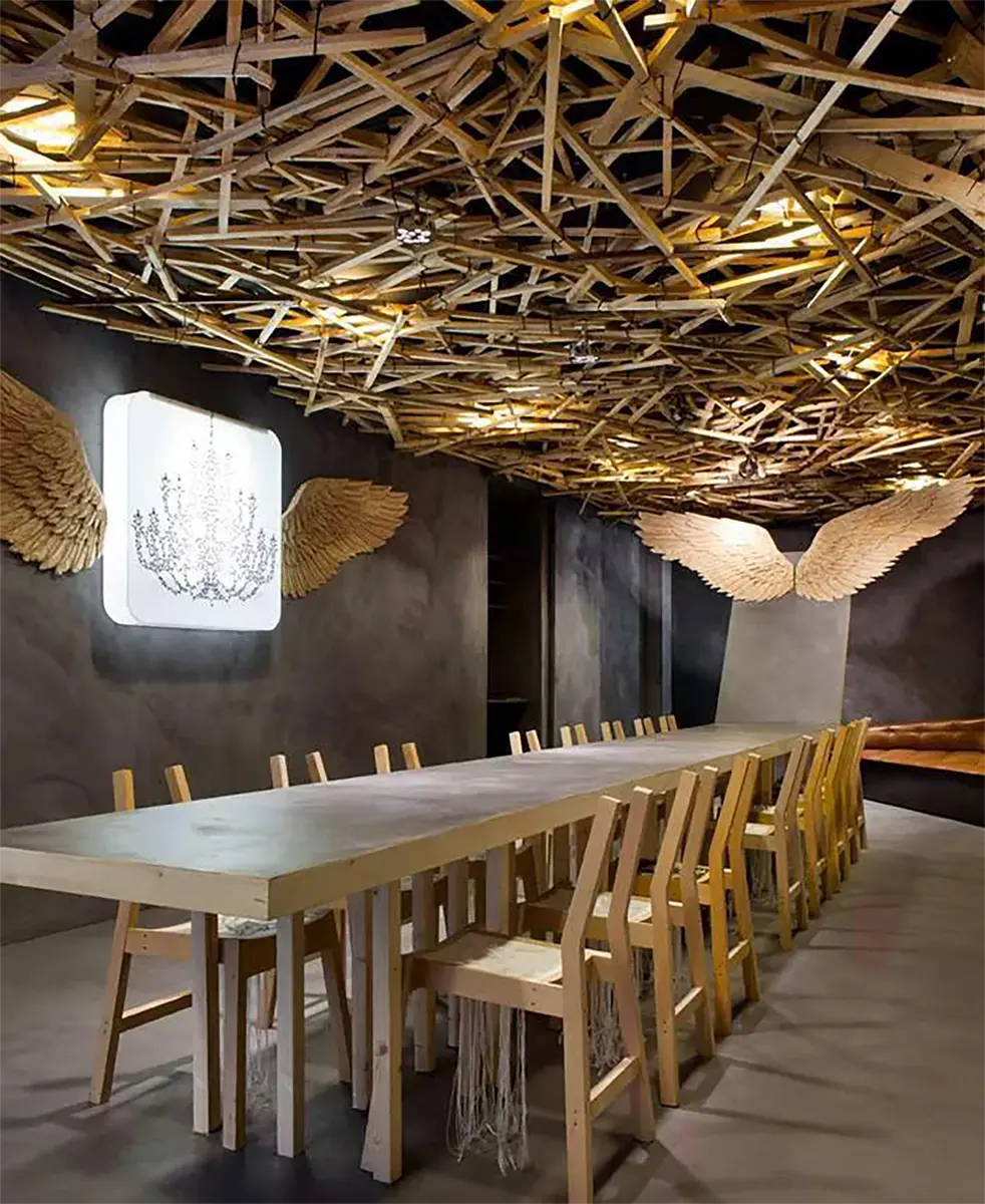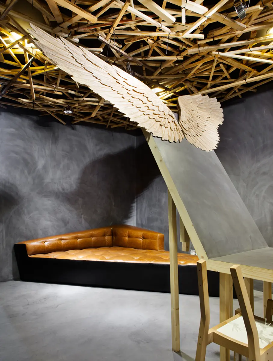 El vuelo, Pablo Neruda. Soñamos despiertos proyectando en el techo la naturaleza de un bosque. Observamos de la naturaleza y extraemos las líneas como elemento activo en la generación del diseño. Creamos un espacio donde se busca dar protagonismo a piezas que inviten a la reflexión, piezas que se expresen por sí mismas buscando un lenguaje que acompañe al pensamiento. Manteniendo la funcionalidad dejamos volar la imaginación. » …el hombre anda perdido si no vuela, no puede comprender la transparencia» El vuelo, Pablo Neruda.