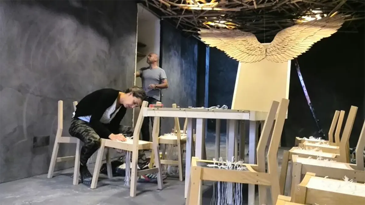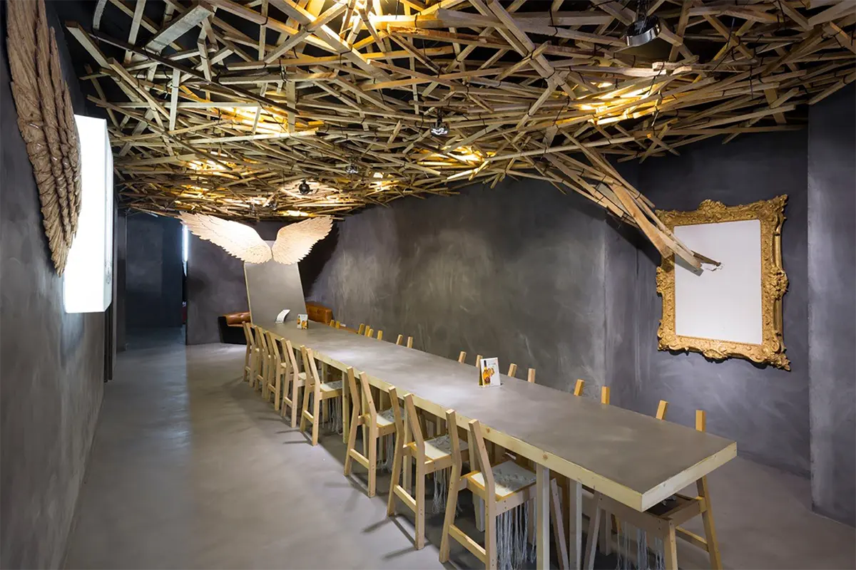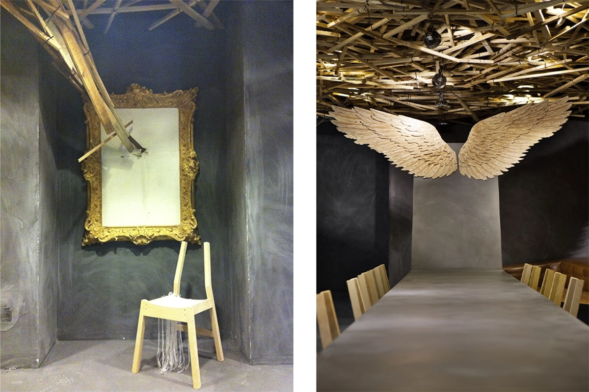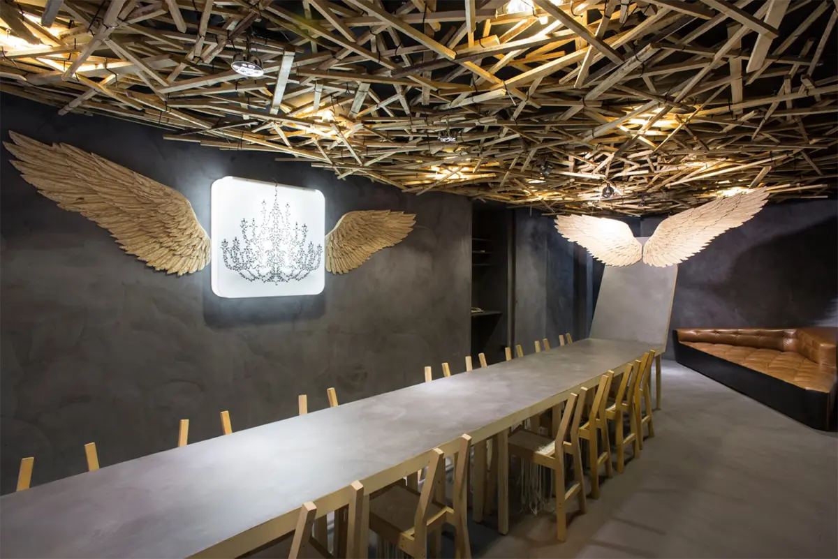 El vuelo, Pablo Neruda. Soñamos despiertos proyectando en el techo la naturaleza de un bosque. Observamos de la naturaleza y extraemos las líneas como elemento activo en la generación del diseño. Creamos un espacio donde se busca dar protagonismo a piezas que inviten a la reflexión, piezas que se expresen por sí mismas buscando un lenguaje que acompañe al pensamiento. Manteniendo la funcionalidad dejamos volar la imaginación. » …el hombre anda perdido si no vuela, no puede comprender la transparencia» El vuelo, Pablo Neruda.