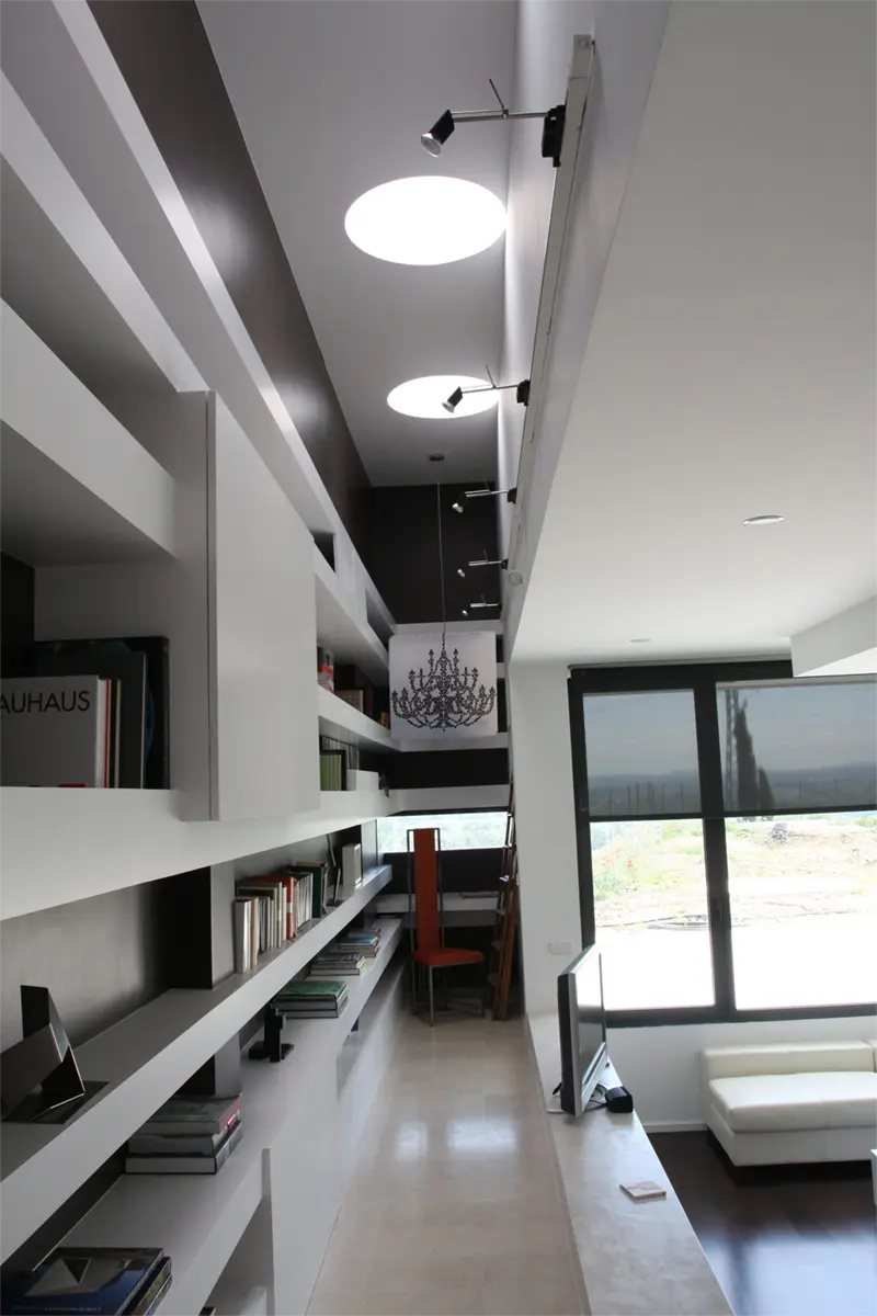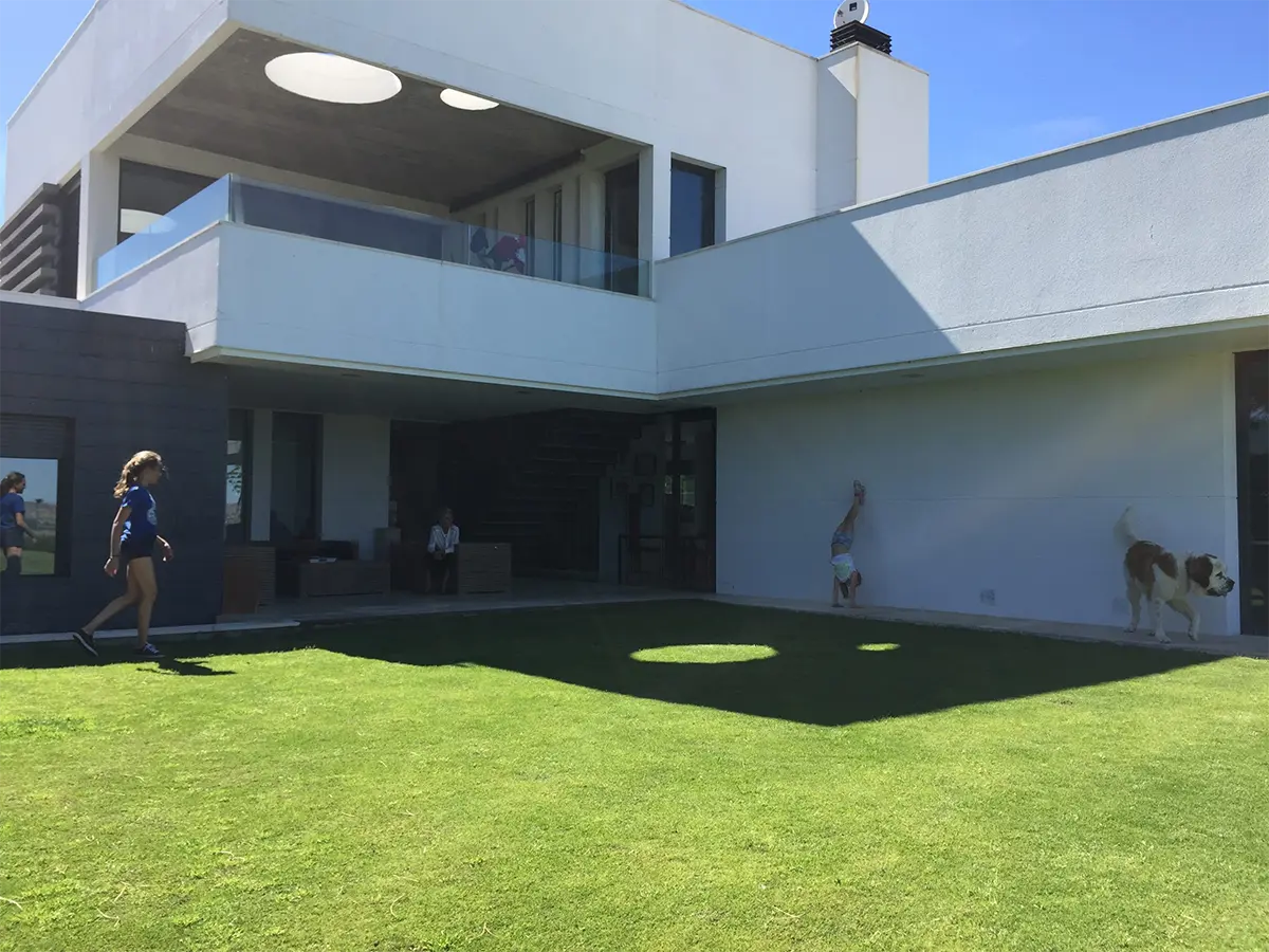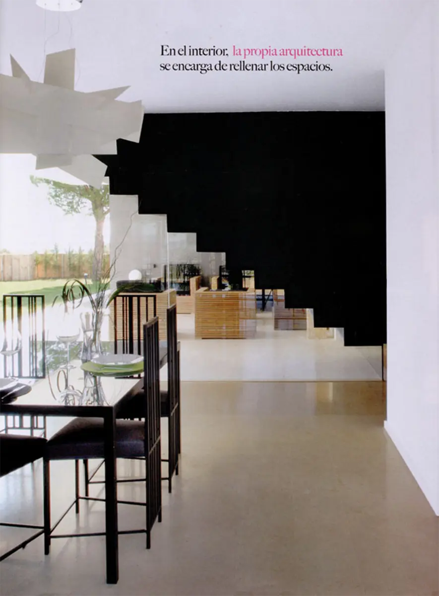 Salón semi enterrado para tener la vista a eje de jardín una vez sentado o tumbado en el sofá. Pastilla de noche al mismo nivel y planta abierta en la intersección con comedor, acceso y cocina que organiza el núcleo de comunicaciones. Únicamente en planta superior se encuentra el dormitorio principal y terraza aislado de los cuatro dormitorios de planta baja que corresponden a los cuatro hijos.