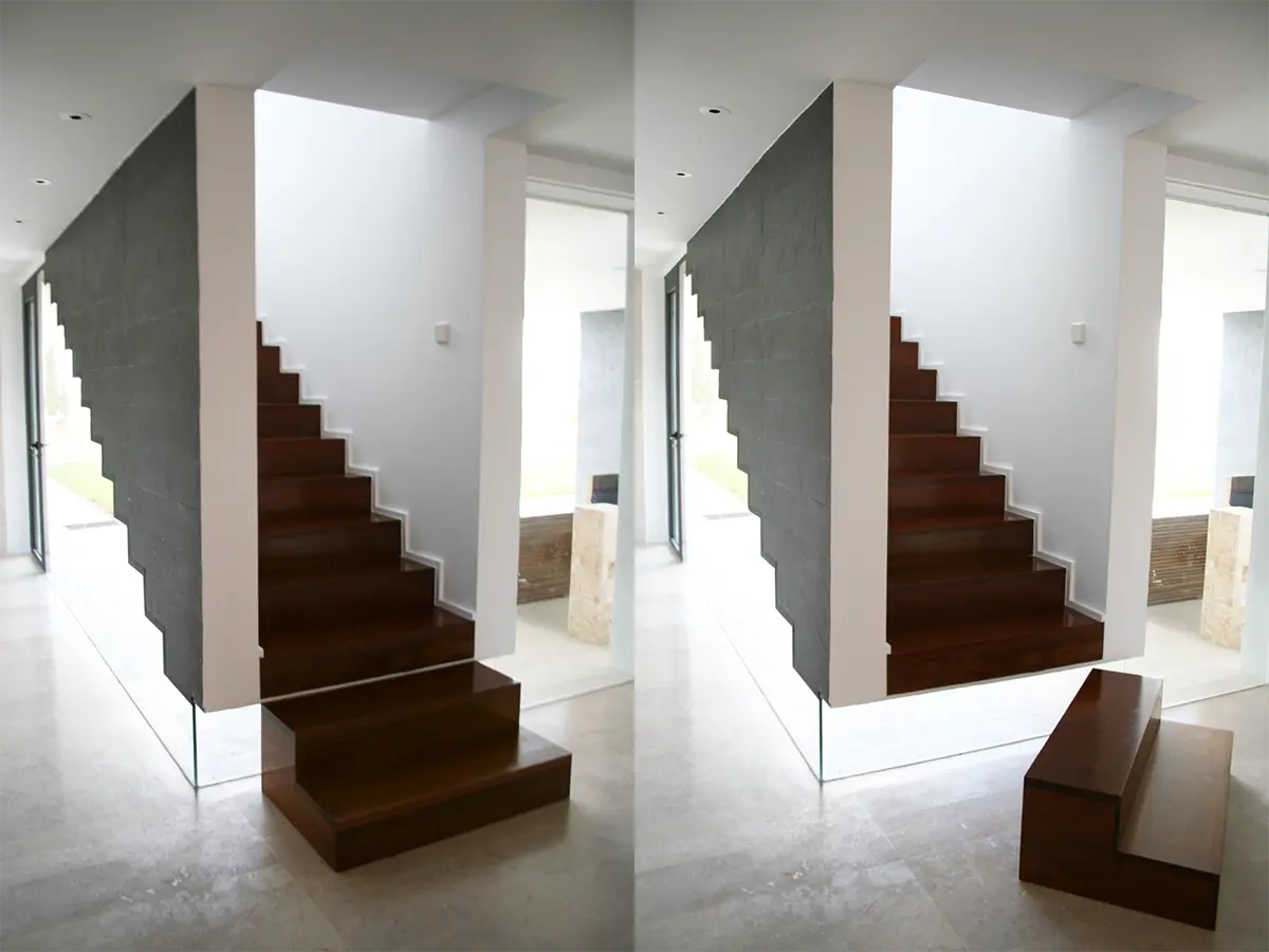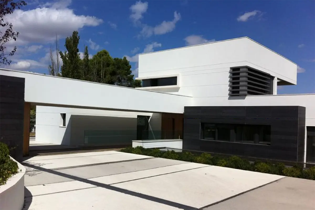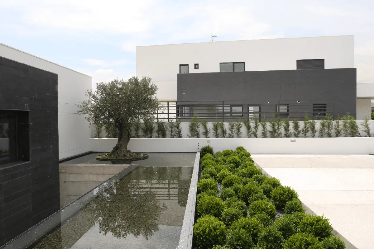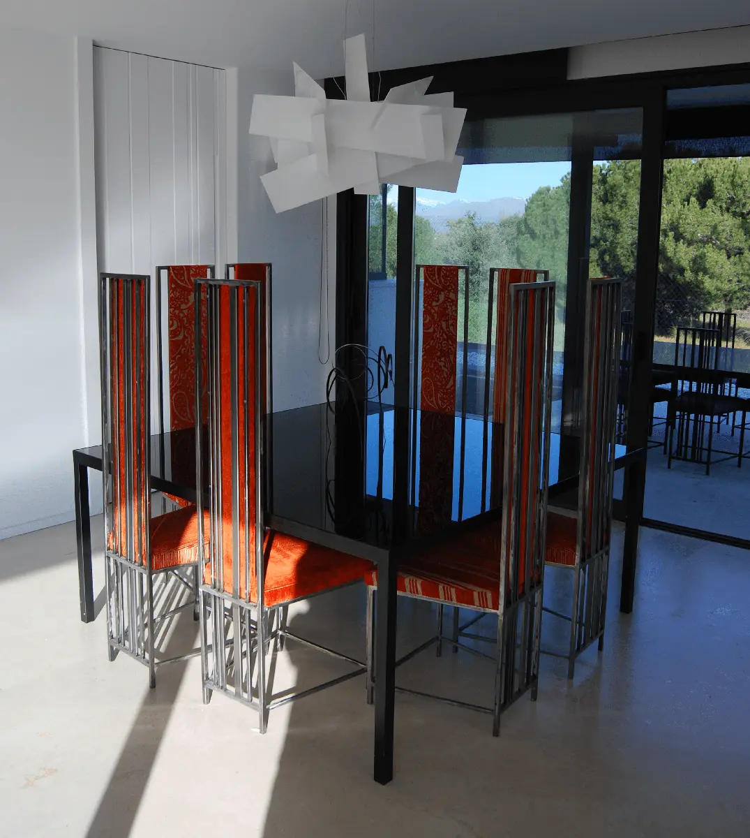 Salón semi enterrado para tener la vista a eje de jardín una vez sentado o tumbado en el sofá. Pastilla de noche al mismo nivel y planta abierta en la intersección con comedor, acceso y cocina que organiza el núcleo de comunicaciones. Únicamente en planta superior se encuentra el dormitorio principal y terraza aislado de los cuatro dormitorios de planta baja que corresponden a los cuatro hijos.