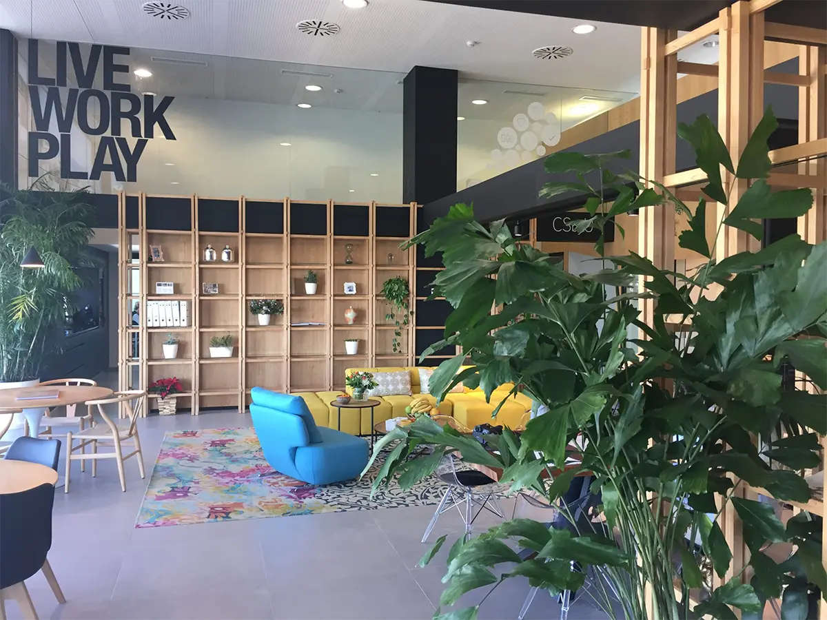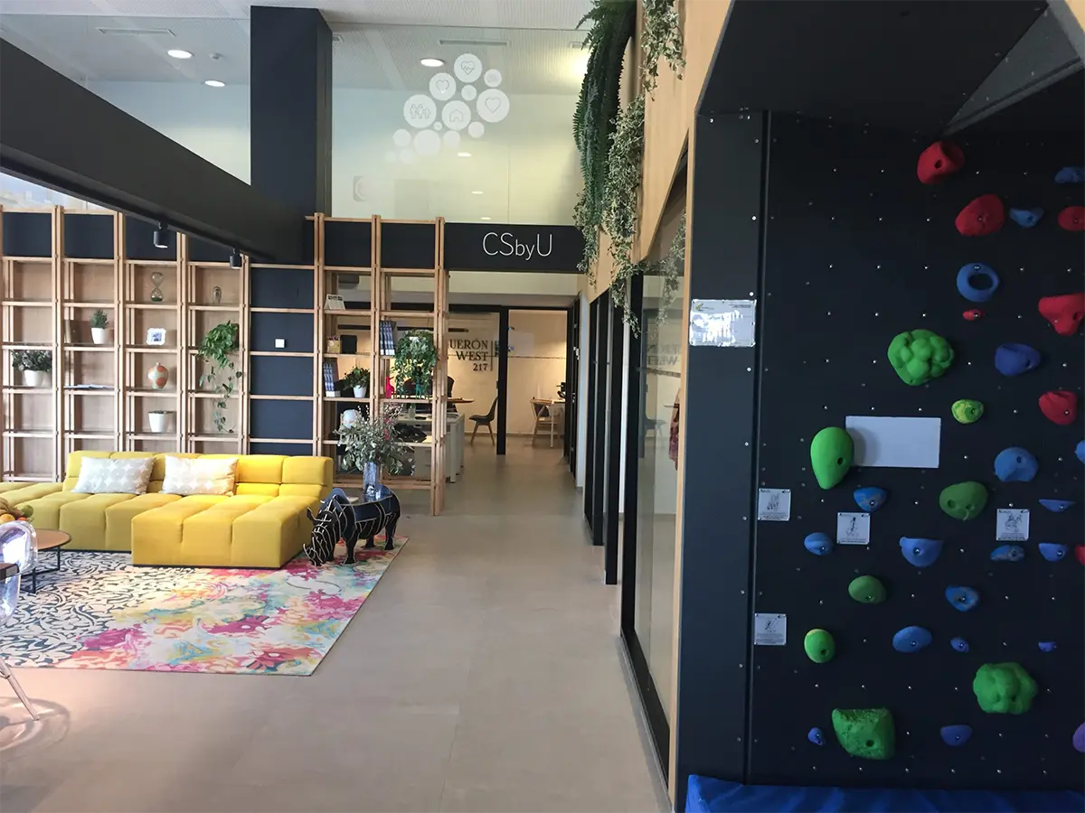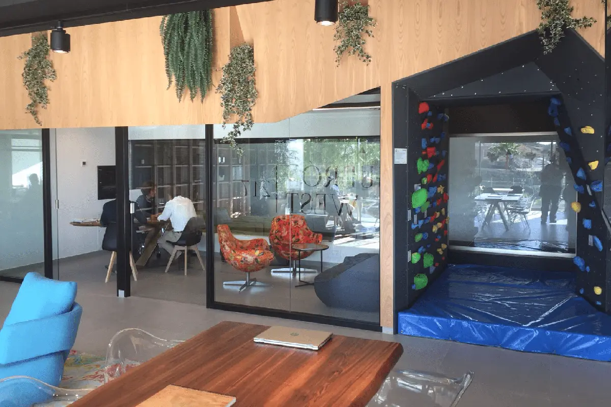 Al adentrarse en este innovador entorno, uno es inmediatamente cautivado por la utilización de materiales naturales, en especial la madera, que evoca un compromiso con el medio ambiente y proporciona una sensación de calidez y bienestar. Las áreas de reunión abiertas facilitan un intercambio fluido y transparente, mientras que los despachos privados ofrecen espacios íntimos sin sacrificar la conexión con el conjunto. Una característica distintiva es el rocódromo para niños, que no solo añade un elemento lúdico sino que también refleja la filosofía de la promoción «Higuerón West»: un lugar donde la vida familiar y el disfrute están en el centro. Este espacio creativo para los más jóvenes permite a los padres explorar y discutir detalles importantes en un ambiente relajado y sin distracciones.