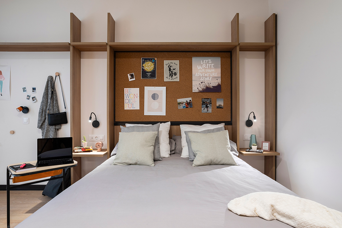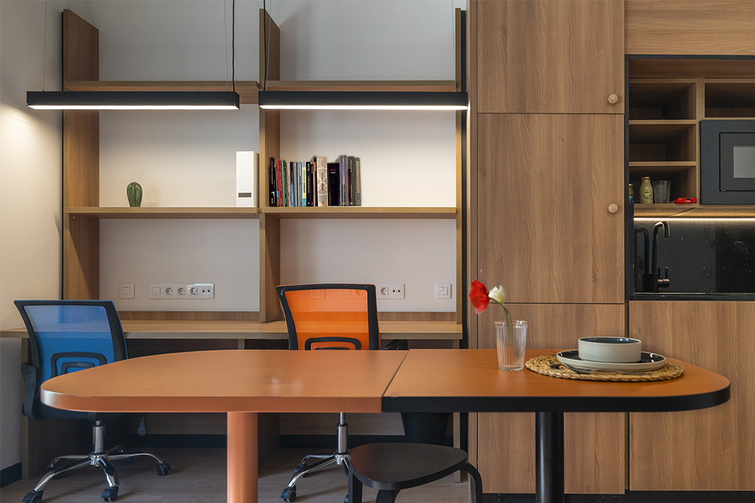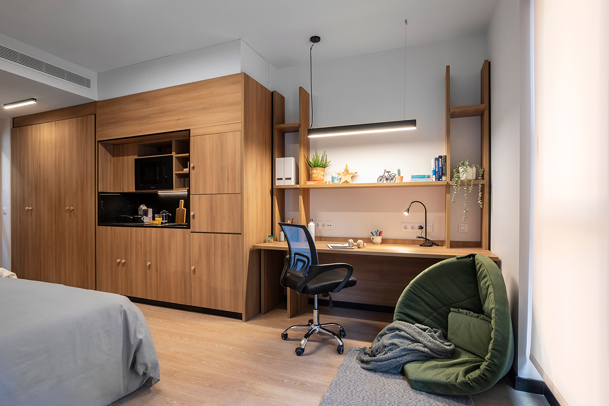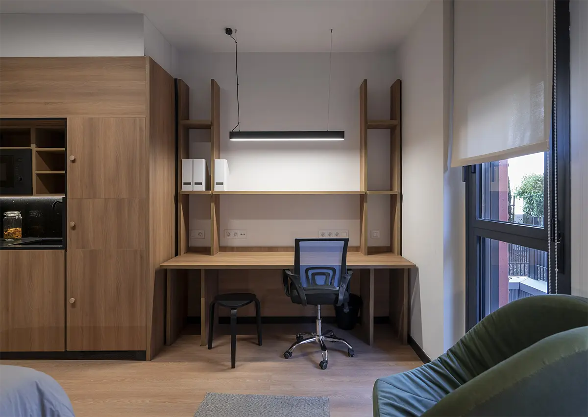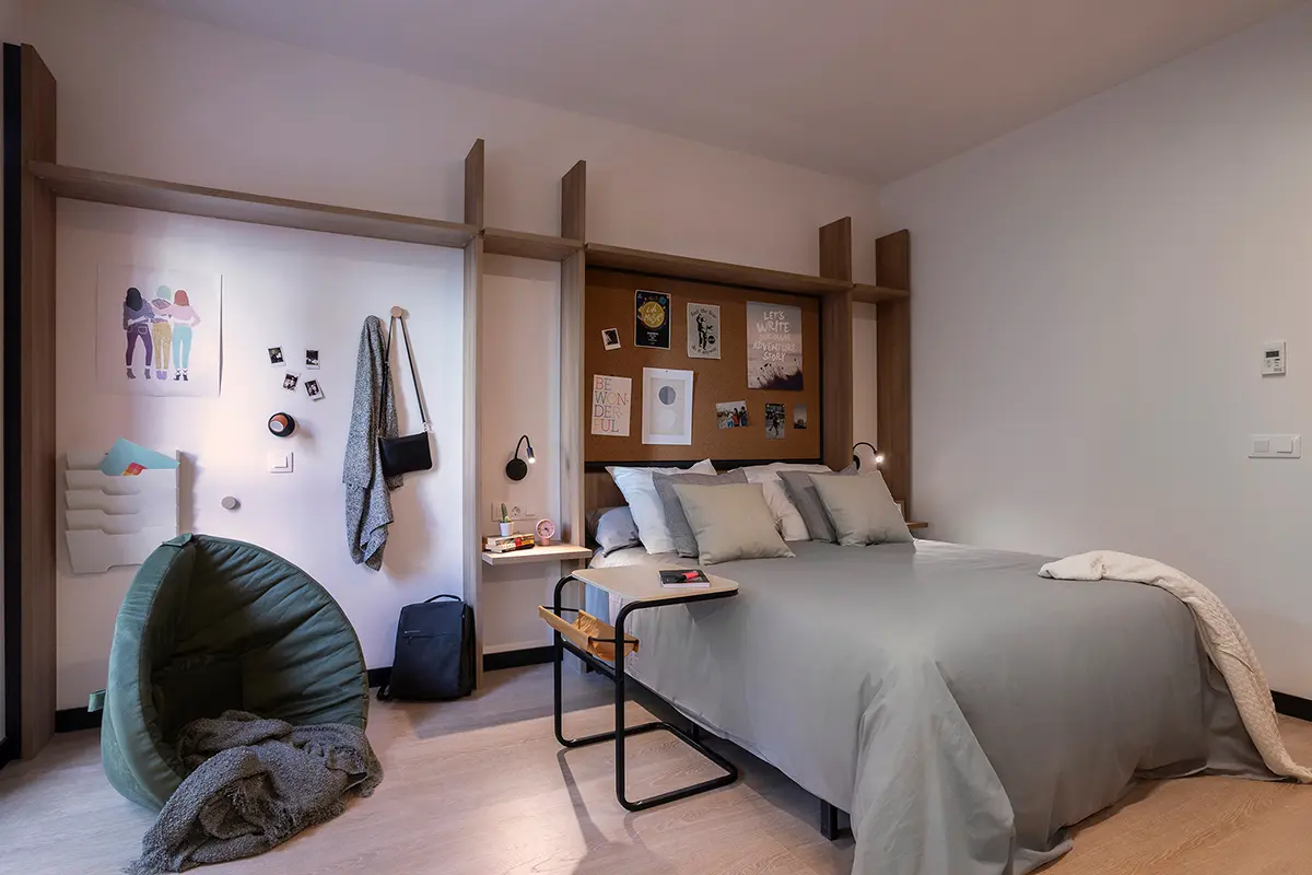 Las habitaciones, por su parte, fueron diseñadas como refugios. Equipadas con cocina propia y nevera, ofrecen independencia y confort. No buscaban ser impresionantes, sino prácticas y acogedoras, adaptándose a los momentos más exigentes de la vida académica, pero también creando calma y descanso.