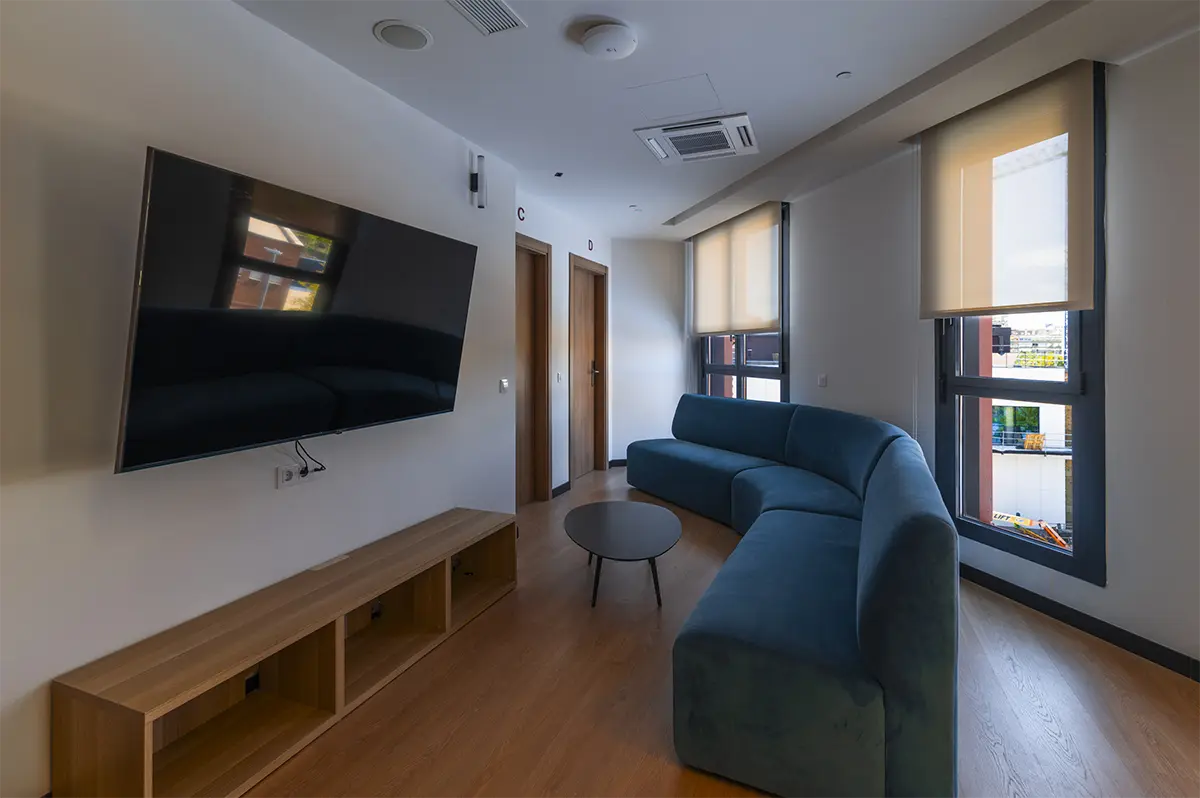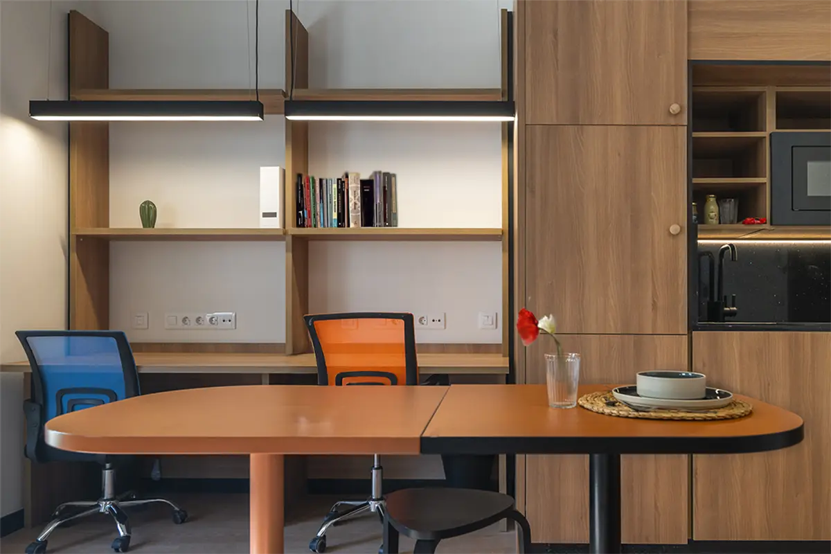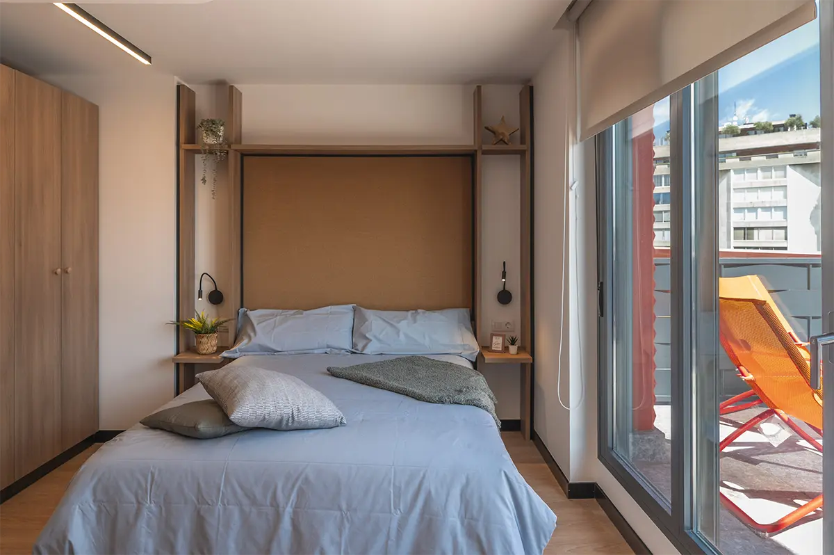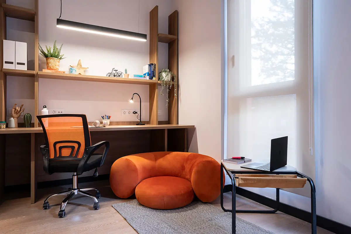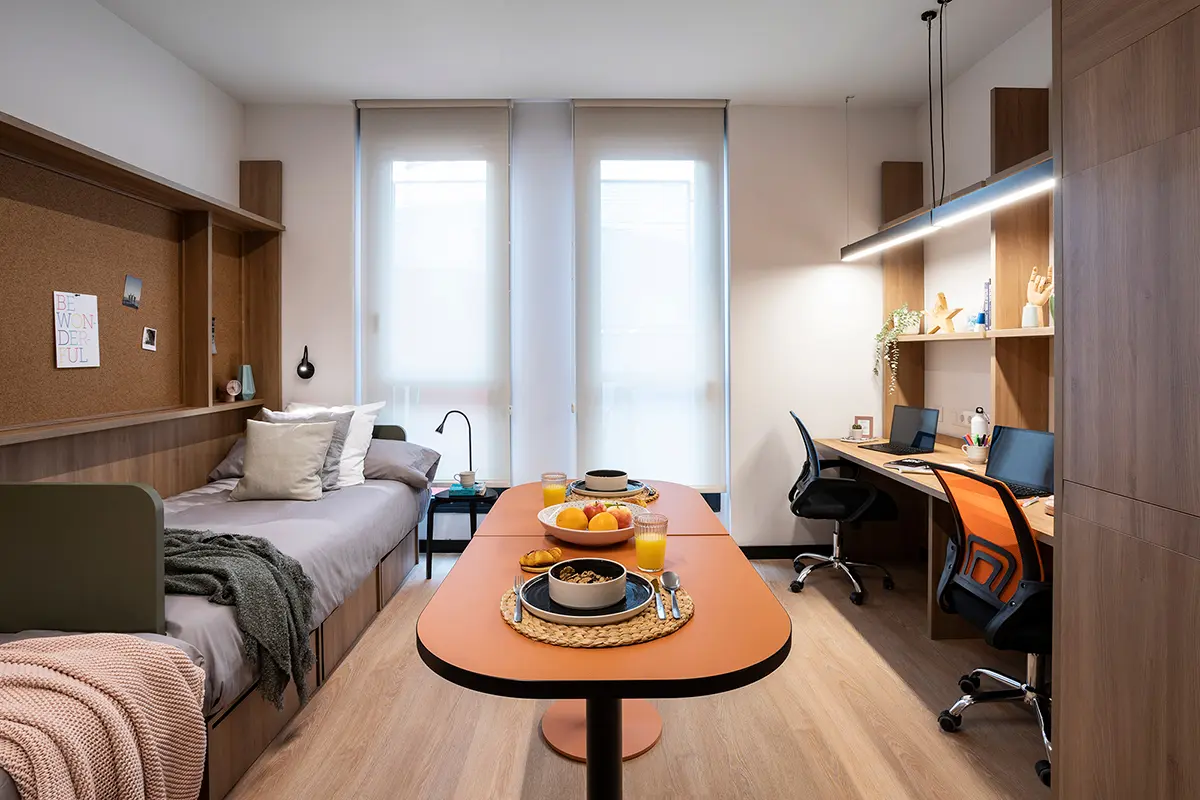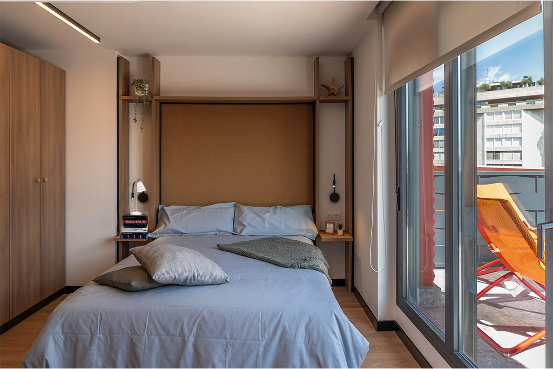 Las habitaciones, por su parte, fueron diseñadas como refugios. Equipadas con cocina propia y nevera, ofrecen independencia y confort. No buscaban ser impresionantes, sino prácticas y acogedoras, adaptándose a los momentos más exigentes de la vida académica, pero también creando calma y descanso.