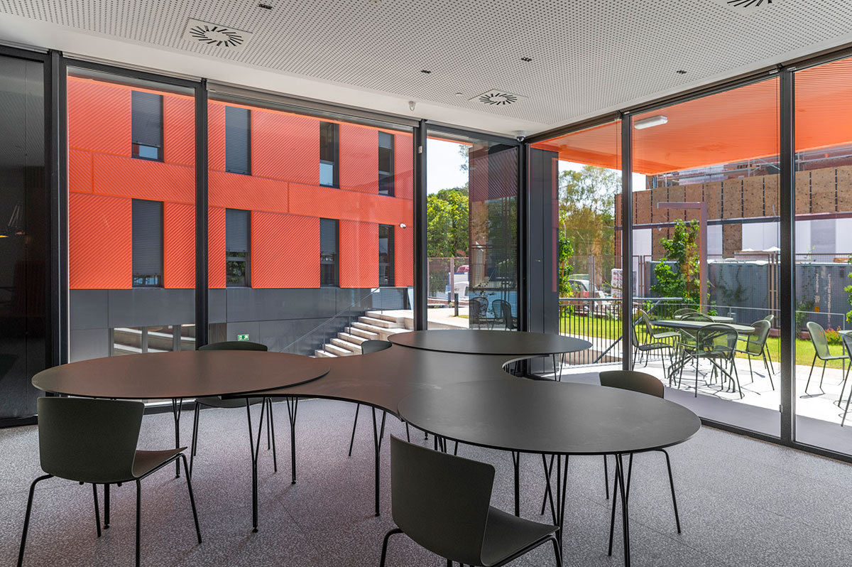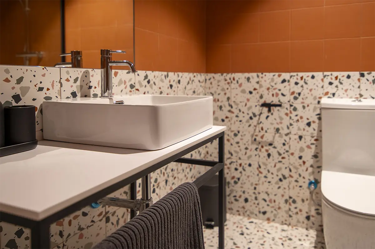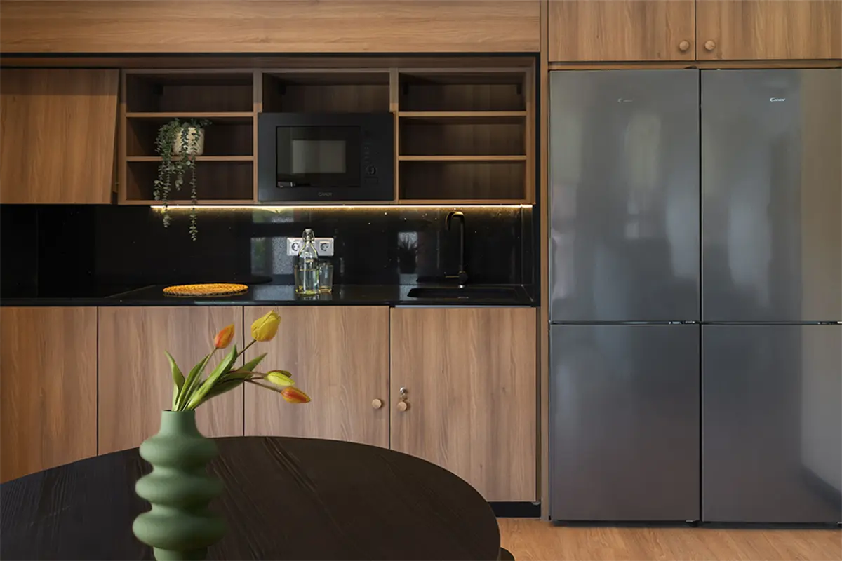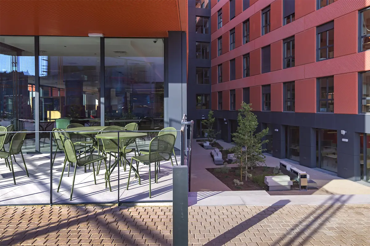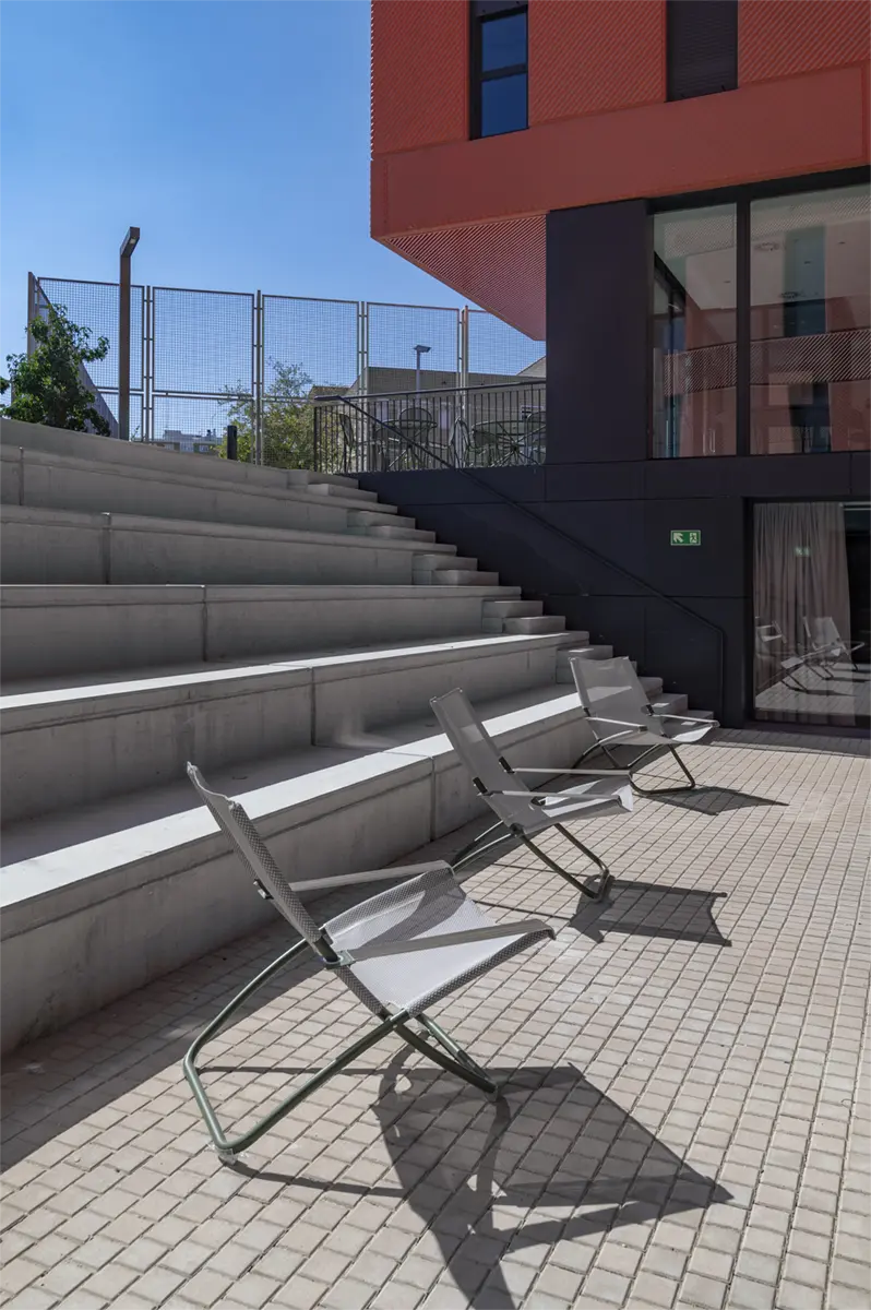 Las habitaciones, por su parte, fueron diseñadas como refugios. Equipadas con cocina propia y nevera, ofrecen independencia y confort. No buscaban ser impresionantes, sino prácticas y acogedoras, adaptándose a los momentos más exigentes de la vida académica, pero también creando calma y descanso.