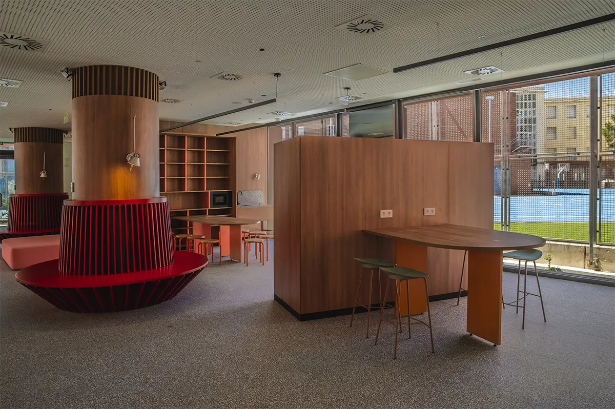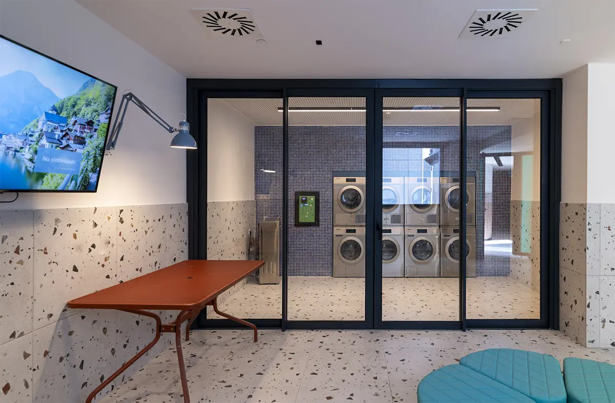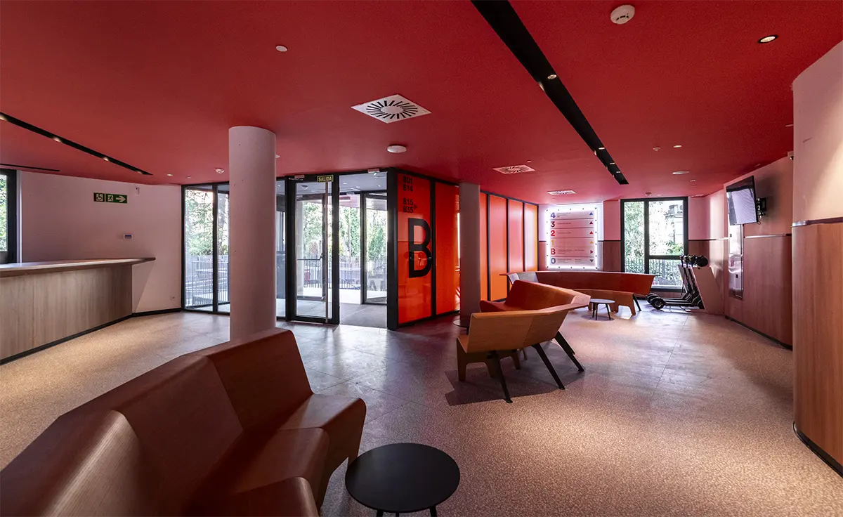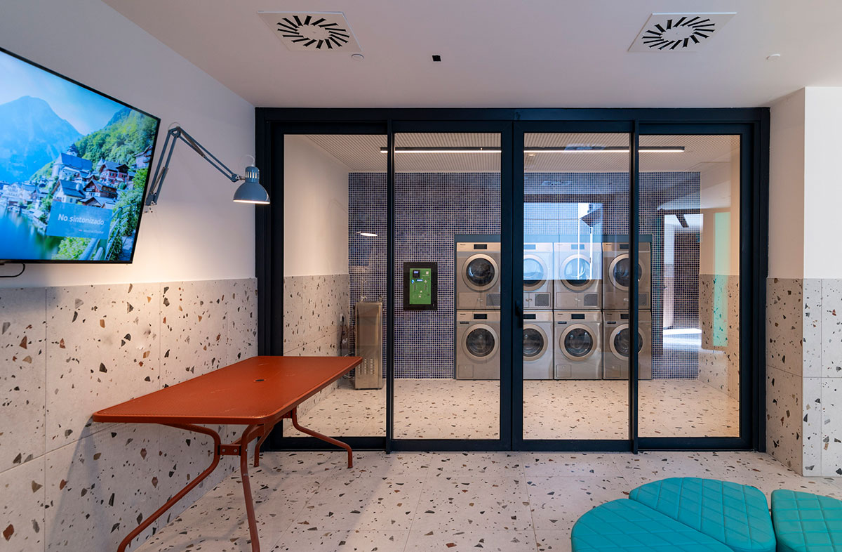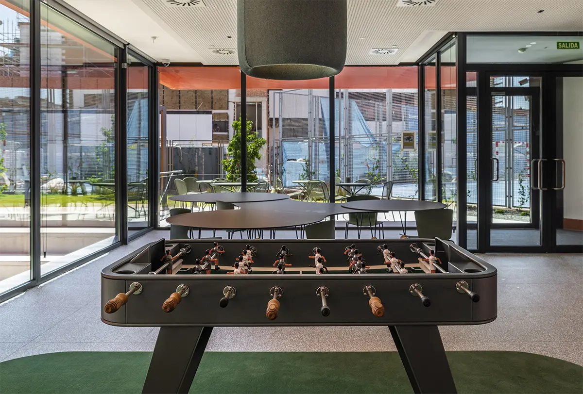 Lo esencial, más que diseñar espacios, era imaginar y diseñar los momentos que ocurren en ellos. Diseñar para que se generen acciones. Por eso, se desarrollaron piezas específicas que dotan a los espacios de infraestructuras de calidad, fomentando la interacción entre los residentes. Imaginamos un espacio grande, como un cuarto de estar de una familia numerosa, donde mientras unos ven la televisión, otros juegan al futbolín, uno lee un libro en un rincón y otro prepara un aperitivo. Sofás amplios, bancos 360º alrededor de pilares, alfombras y techos acústicos que delimitan áreas sin paredes rígidas convierten la zona común en un lugar flexible y acogedor, con una luz cálida e indirecta que los propios usuarios pueden regular.