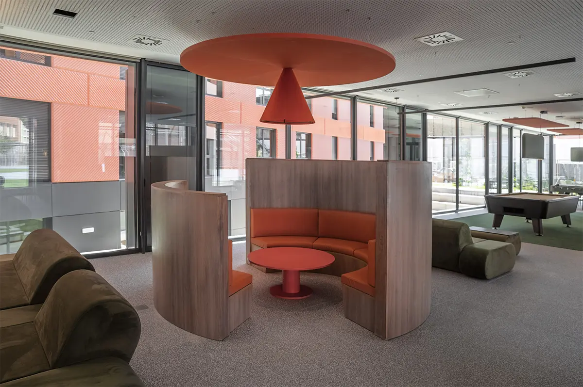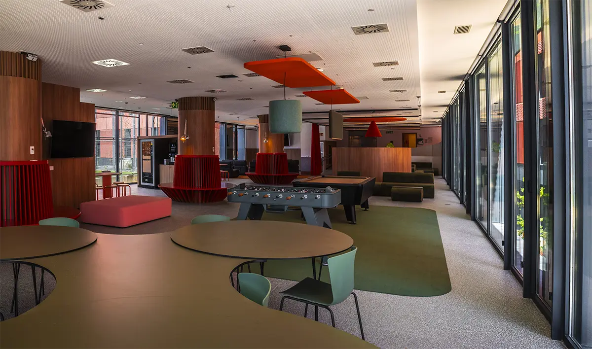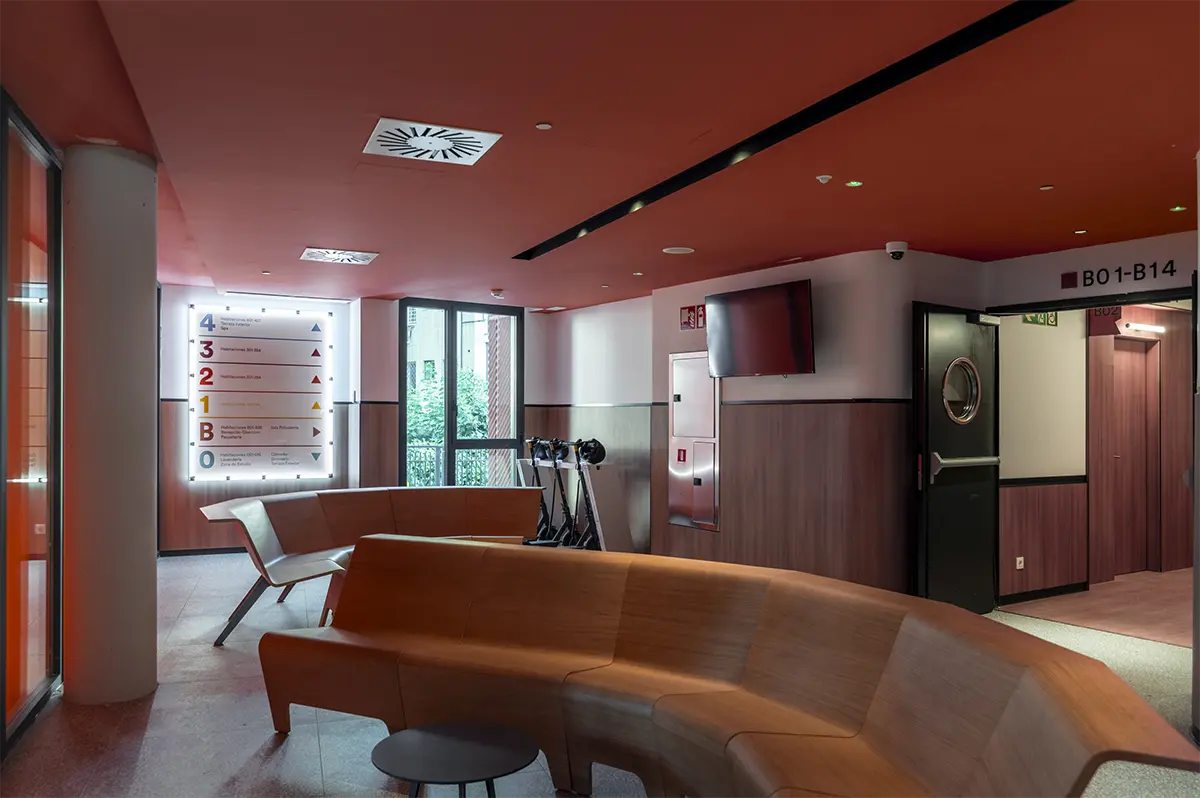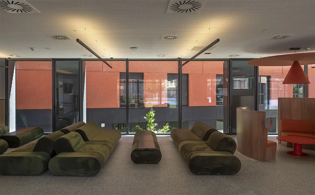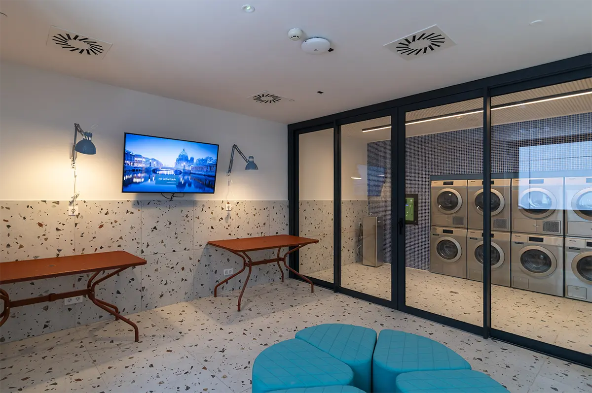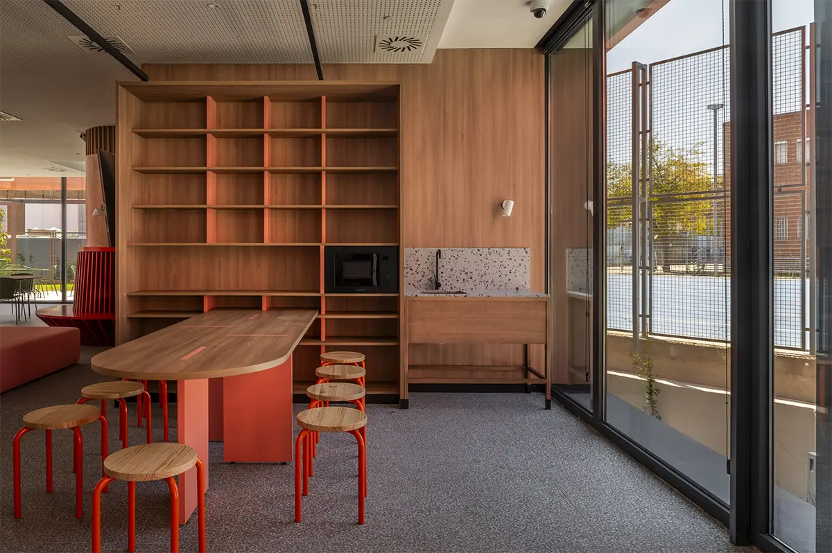 Lo esencial, más que diseñar espacios, era imaginar y diseñar los momentos que ocurren en ellos. Diseñar para que se generen acciones. Por eso, se desarrollaron piezas específicas que dotan a los espacios de infraestructuras de calidad, fomentando la interacción entre los residentes. Imaginamos un espacio grande, como un cuarto de estar de una familia numerosa, donde mientras unos ven la televisión, otros juegan al futbolín, uno lee un libro en un rincón y otro prepara un aperitivo. Sofás amplios, bancos 360º alrededor de pilares, alfombras y techos acústicos que delimitan áreas sin paredes rígidas convierten la zona común en un lugar flexible y acogedor, con una luz cálida e indirecta que los propios usuarios pueden regular.