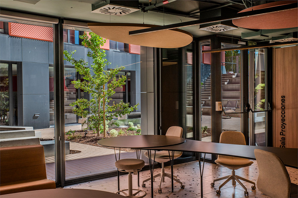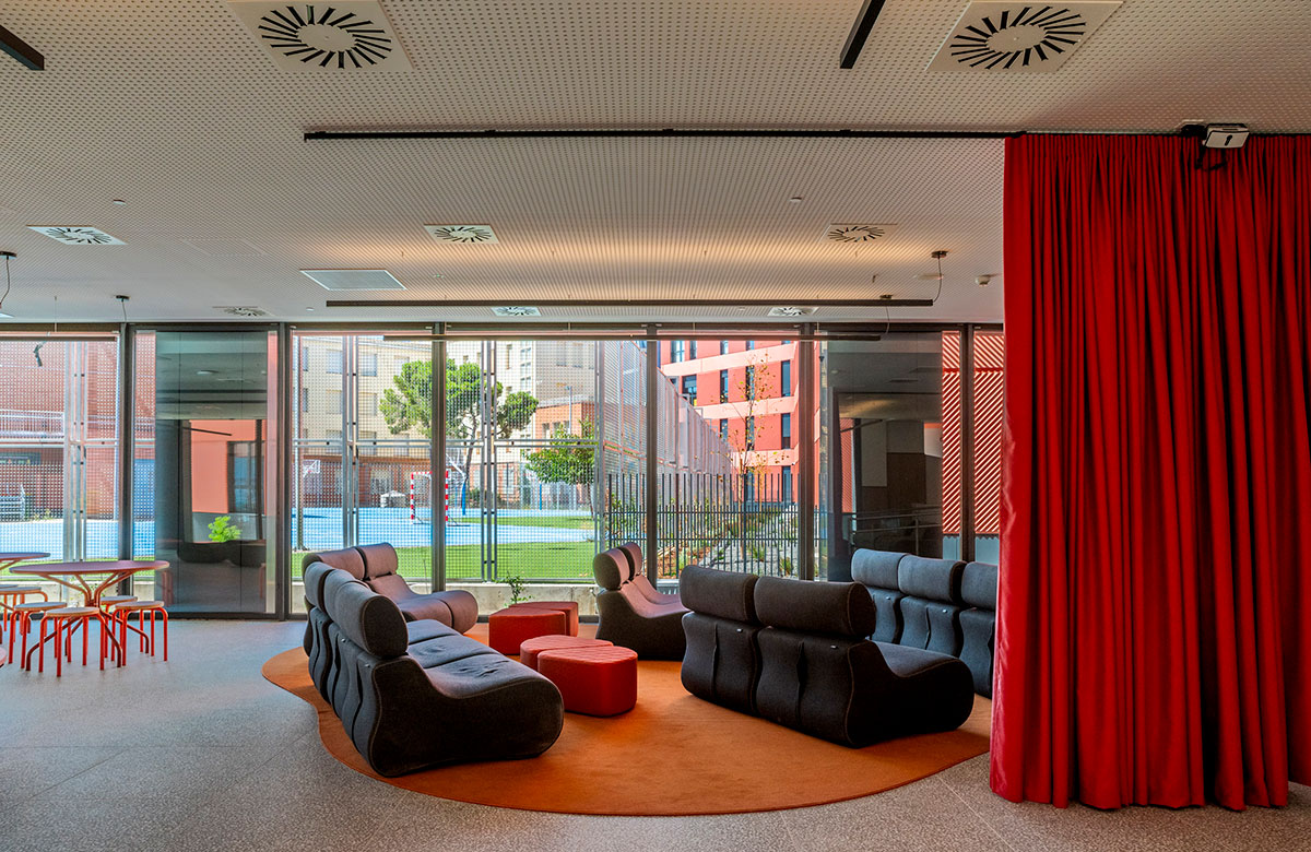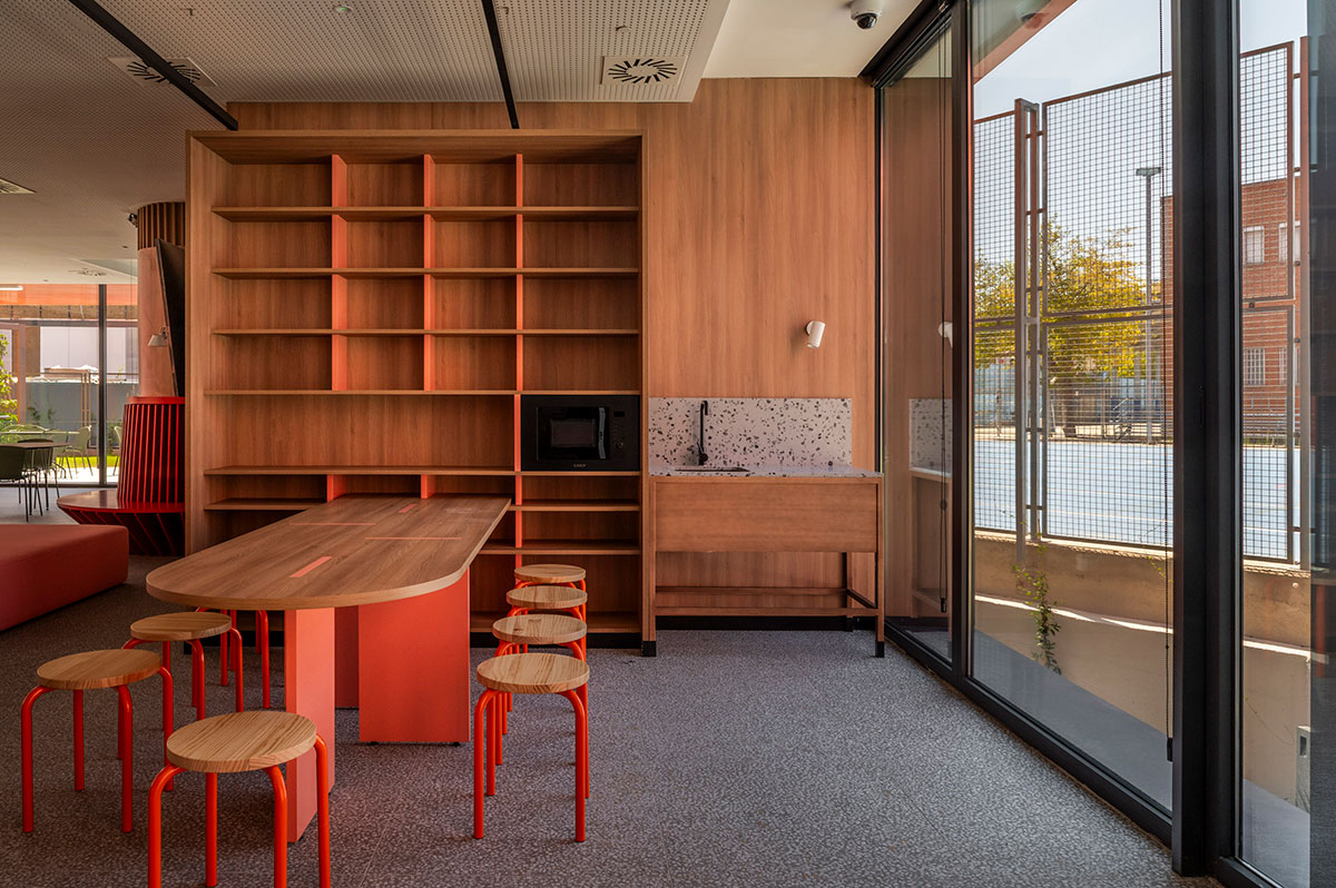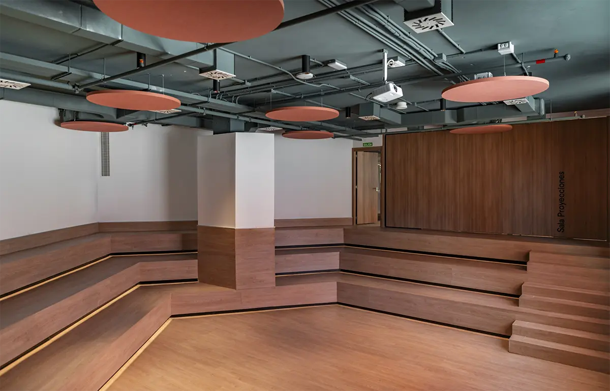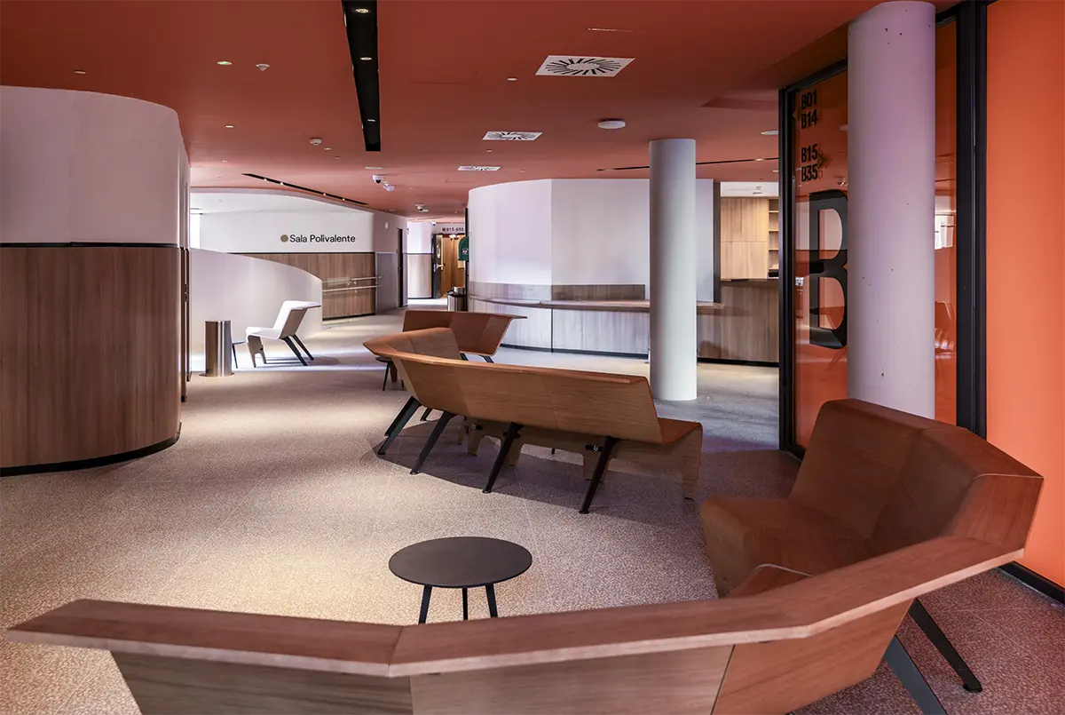 En la sala de estudios se rompe con la frialdad de las bibliotecas tradicionales. Se piensa en una atmósfera que impregna dinamismo. Mesas con formas orgánicas y modulables (de Sellex) invitan a trabajar en equipo, mientras que cortinas móviles permiten transformar el espacio según lo que se necesite: desde pequeños rincones para concentrarse hasta un gran espacio para proyectos colectivos. Incluso el auditorio, concebido como un anfiteatro de madera, fue diseñado como un espacio polivalente, otro formato alternativo para conectar y aprender.
