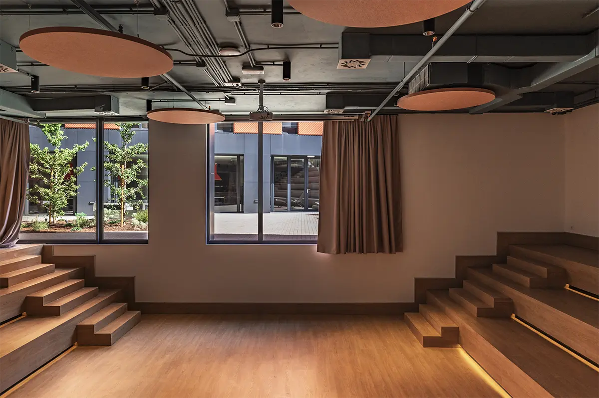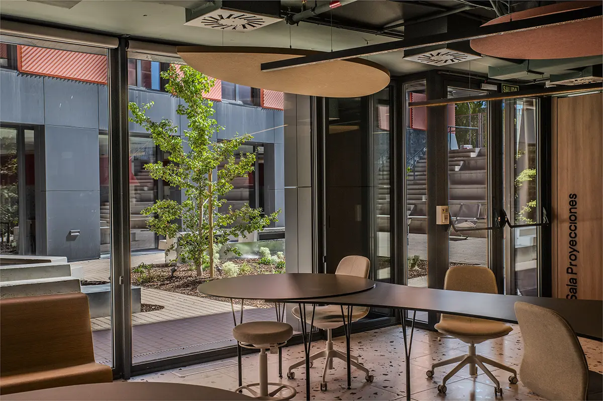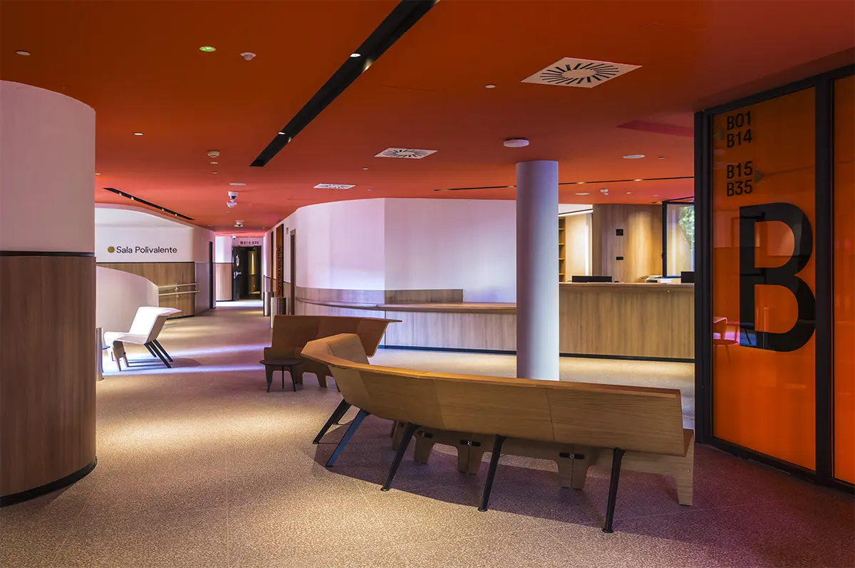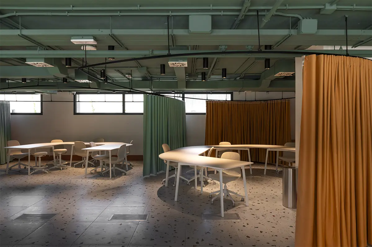 En la sala de estudios se rompe con la frialdad de las bibliotecas tradicionales. Se piensa en una atmósfera que impregna dinamismo. Mesas con formas orgánicas y modulables (de Sellex) invitan a trabajar en equipo, mientras que cortinas móviles permiten transformar el espacio según lo que se necesite: desde pequeños rincones para concentrarse hasta un gran espacio para proyectos colectivos. Incluso el auditorio, concebido como un anfiteatro de madera, fue diseñado como un espacio polivalente, otro formato alternativo para conectar y aprender.