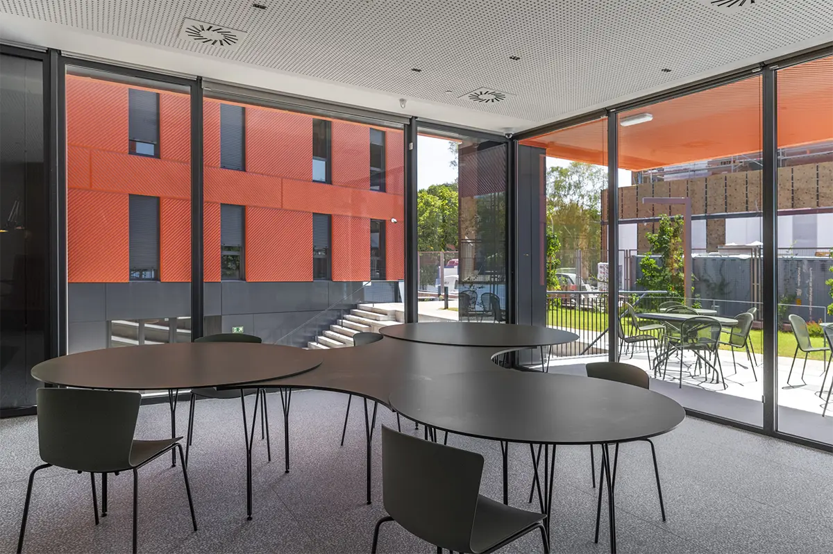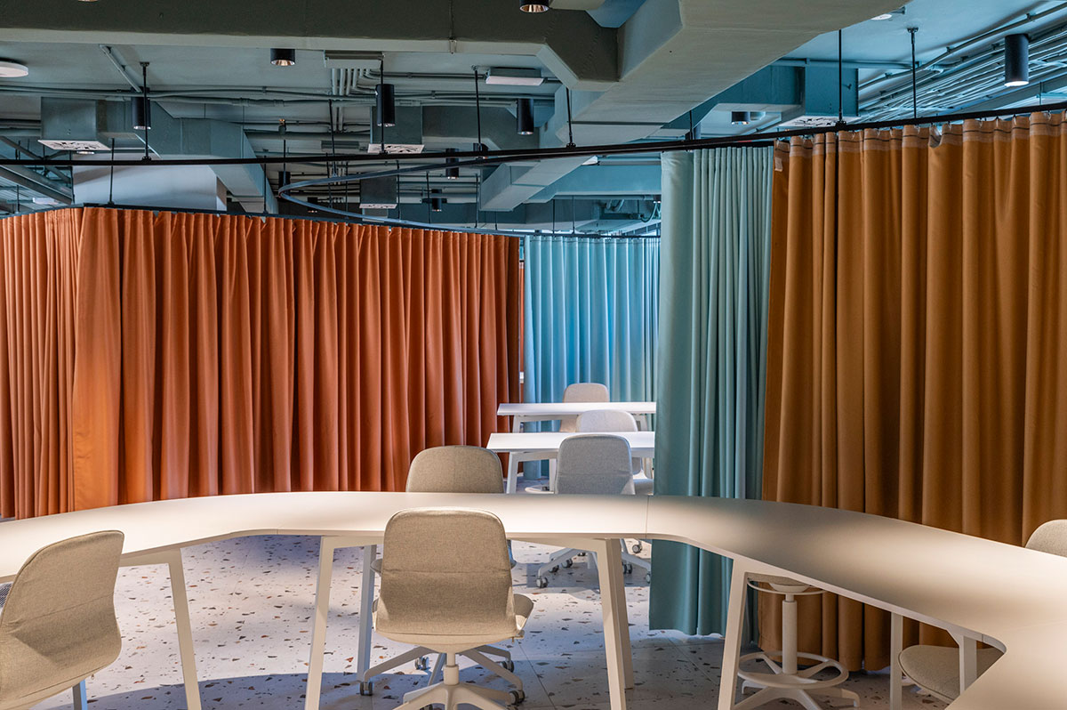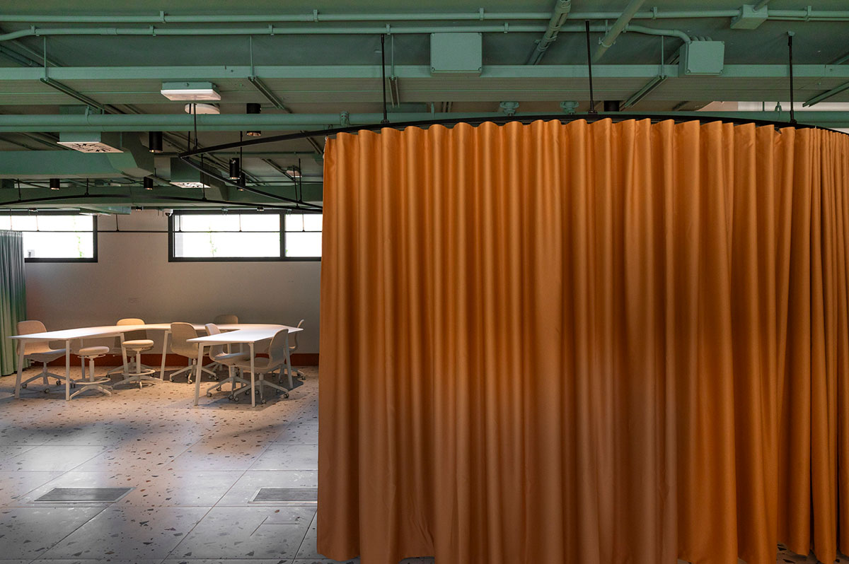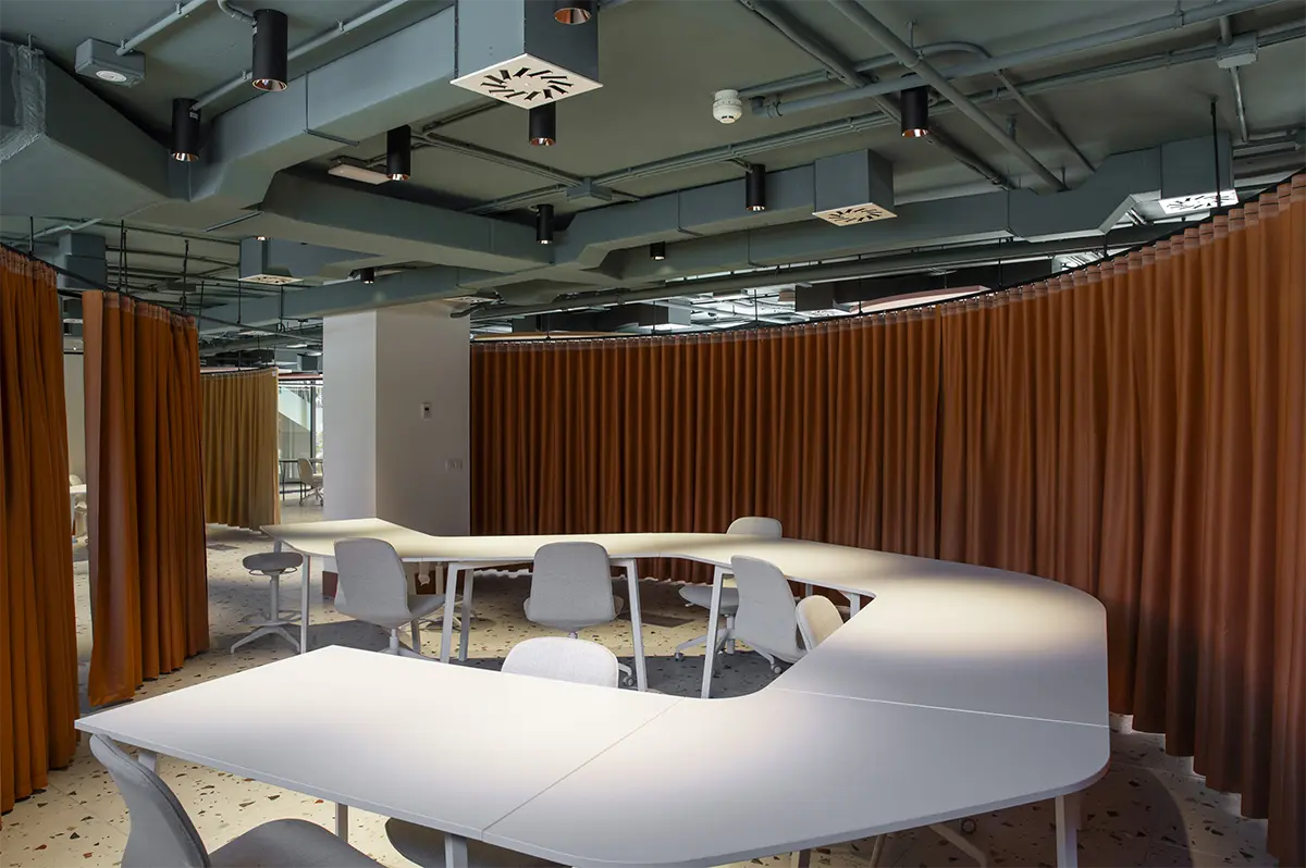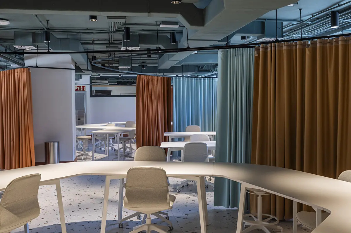 En la sala de estudios se rompe con la frialdad de las bibliotecas tradicionales. Se piensa en una atmósfera que impregna dinamismo. Mesas con formas orgánicas y modulables (de Sellex) invitan a trabajar en equipo, mientras que cortinas móviles permiten transformar el espacio según lo que se necesite: desde pequeños rincones para concentrarse hasta un gran espacio para proyectos colectivos. Incluso el auditorio, concebido como un anfiteatro de madera, fue diseñado como un espacio polivalente, otro formato alternativo para conectar y aprender.