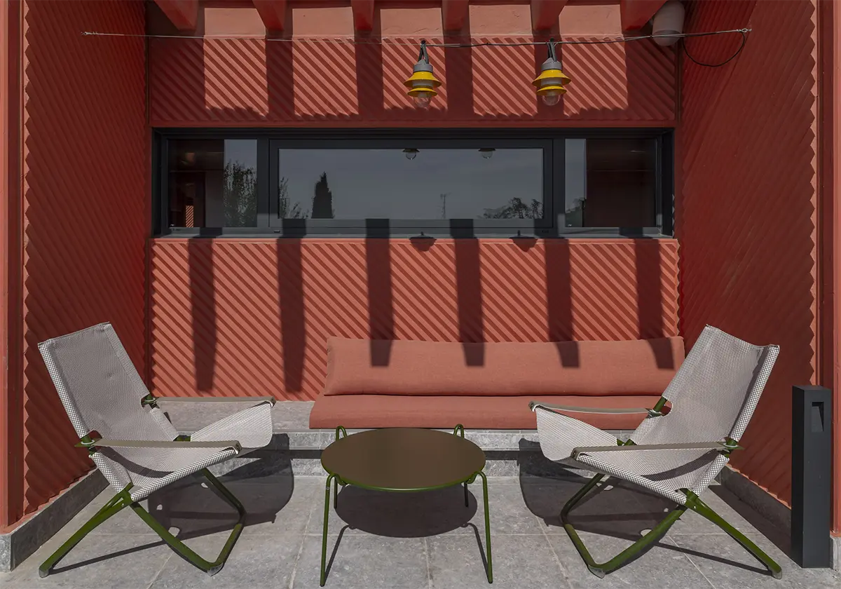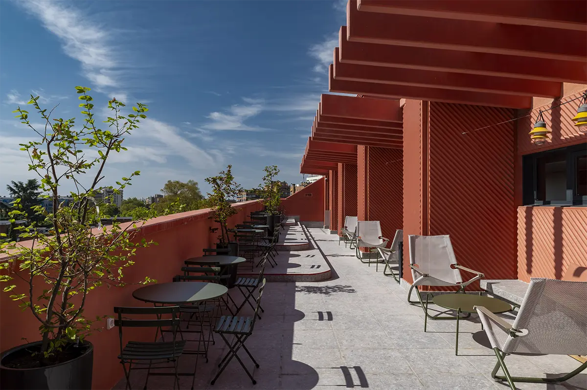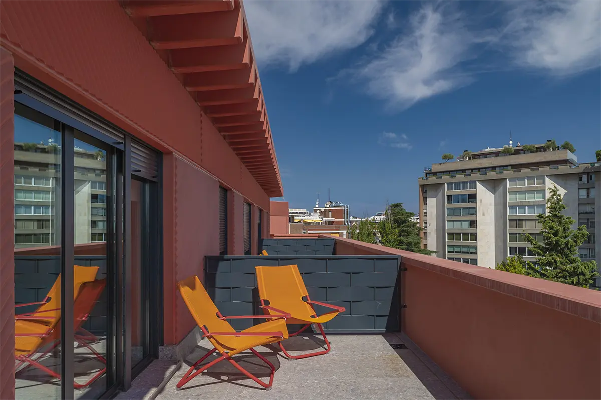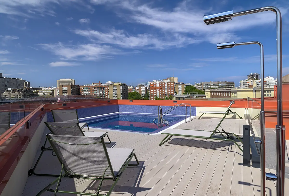 Como valor añadido, el rooftop es un espacio que suma un nuevo nivel de sensaciones. Una terraza con una piscina pequeña ofrece un respiro, un lugar donde conectar con el cielo de Madrid y disfrutar de sus vistas. Diseñar momentos al aire libre era imprescindible para completar esta vida de comunidad y bienestar. En general son espacios para crear recuerdos. Porque el diseño debe marcar la vida de quienes lo habitan, dejando huellas que trascienden el tiempo.
