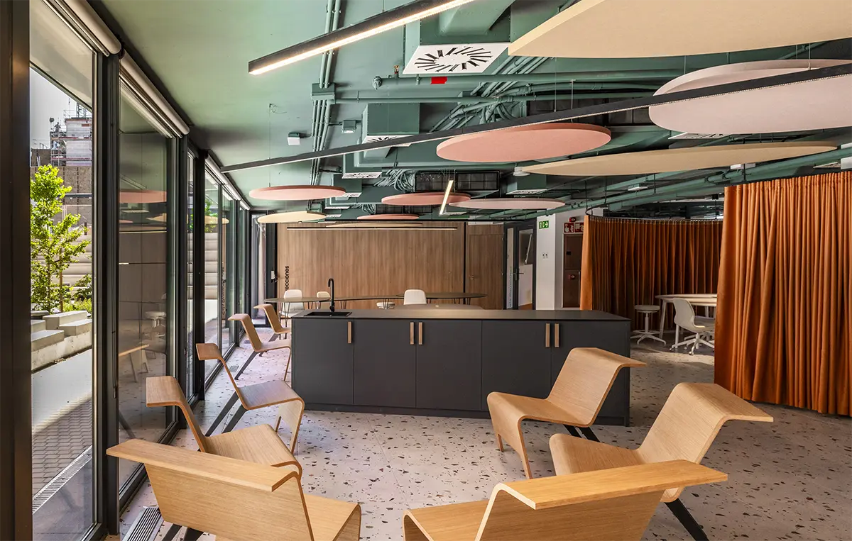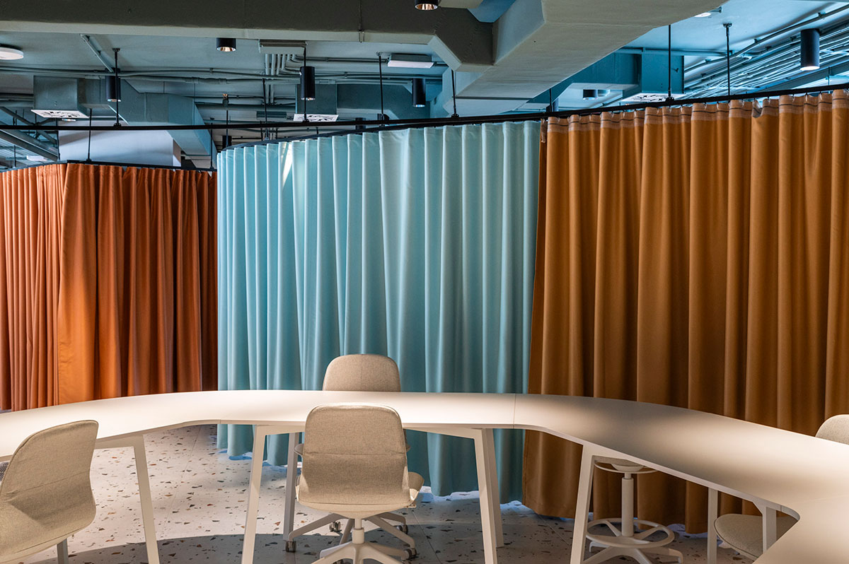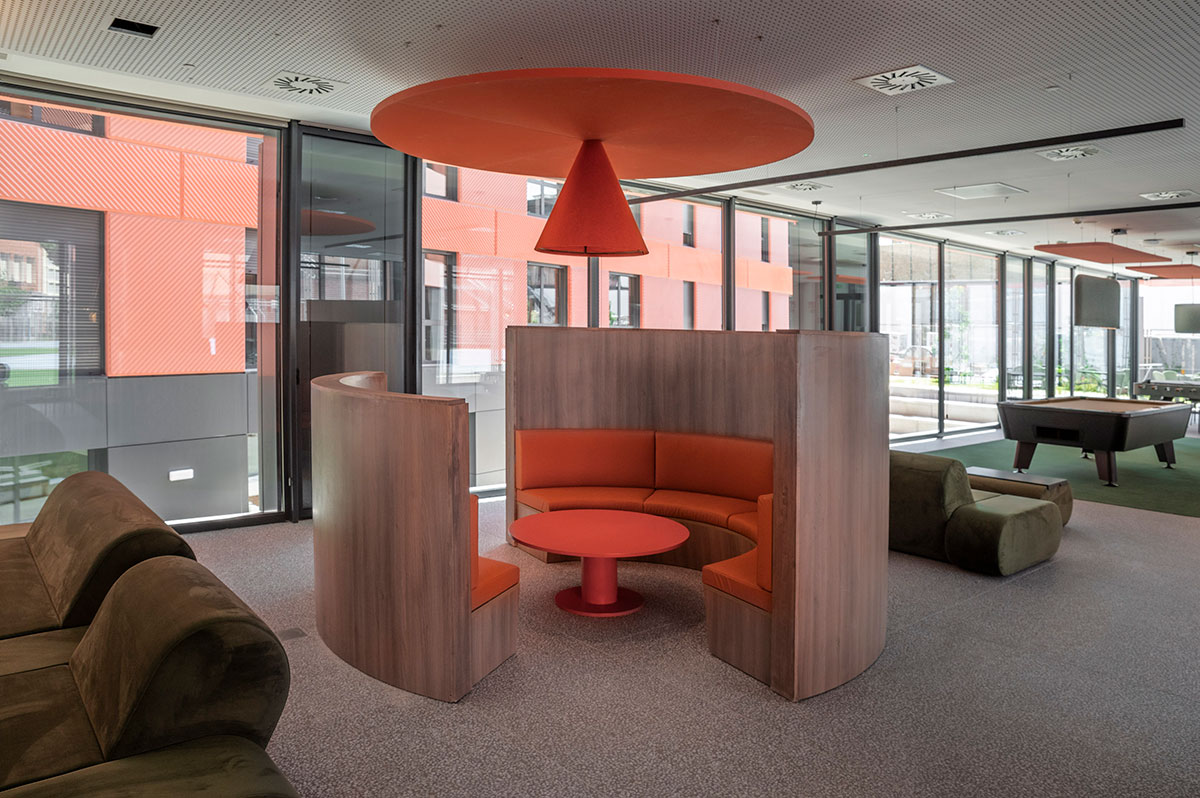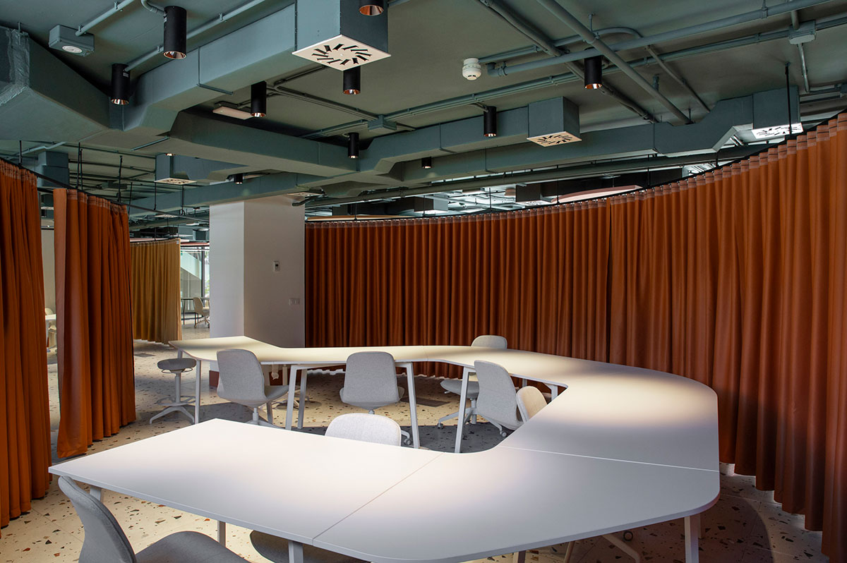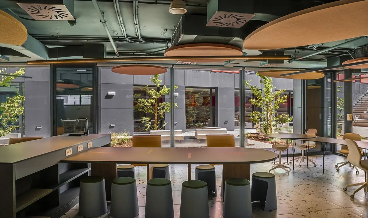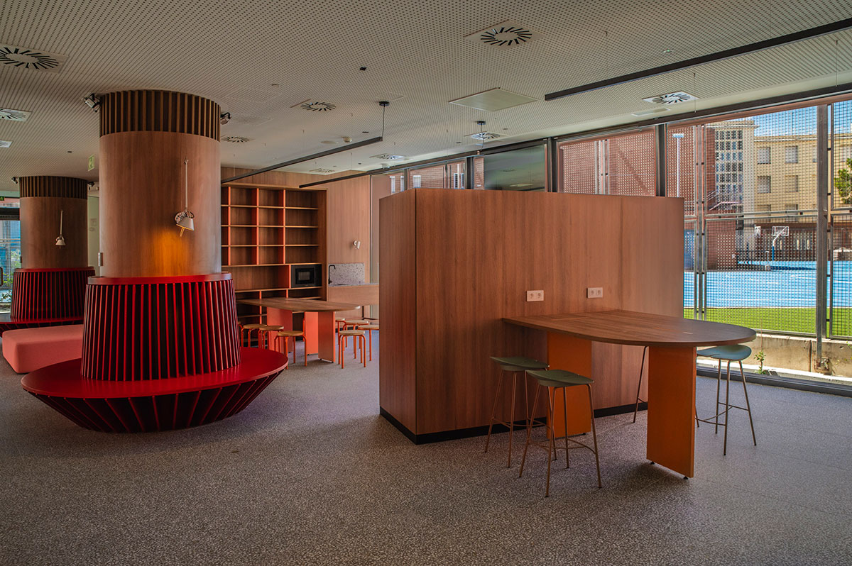 En el comedor se diseñaron a medida unas lámparas acústicas en forma de campanas que proyectan una iluminación baja, cálida y directa, a la vez que resuelven el ruido y rompen visualmente un espacio tan grande. Pero este comedor no es solo para comer; es un espacio para estudiar, charlar, improvisar reuniones o, simplemente, estar. Cada espacio ofrece opciones y enseña a tomar decisiones. Por ejemplo, en las zonas comunes hay pequeños office: desde una cocina central en la sala de estudio que puede convertirse en un espacio de showcooking, hasta rincones en la sala social o corners en el comedor. Este diseño siempre ofrece libertad para elegir: ¿preparo algo o disfruto del servicio del comedor? Así, se nutre la capacidad de elección y el sentido de pertenencia en el lugar.