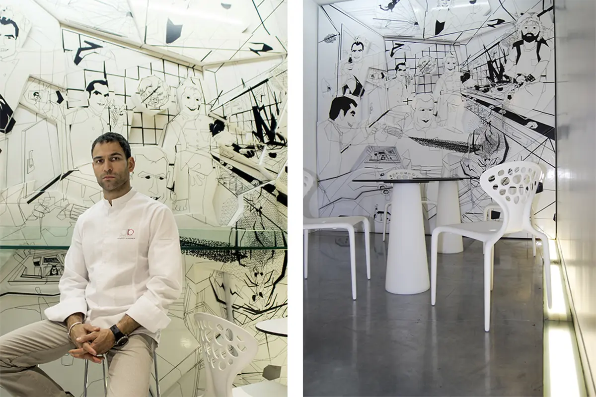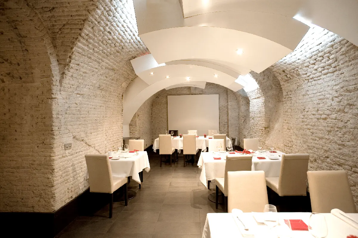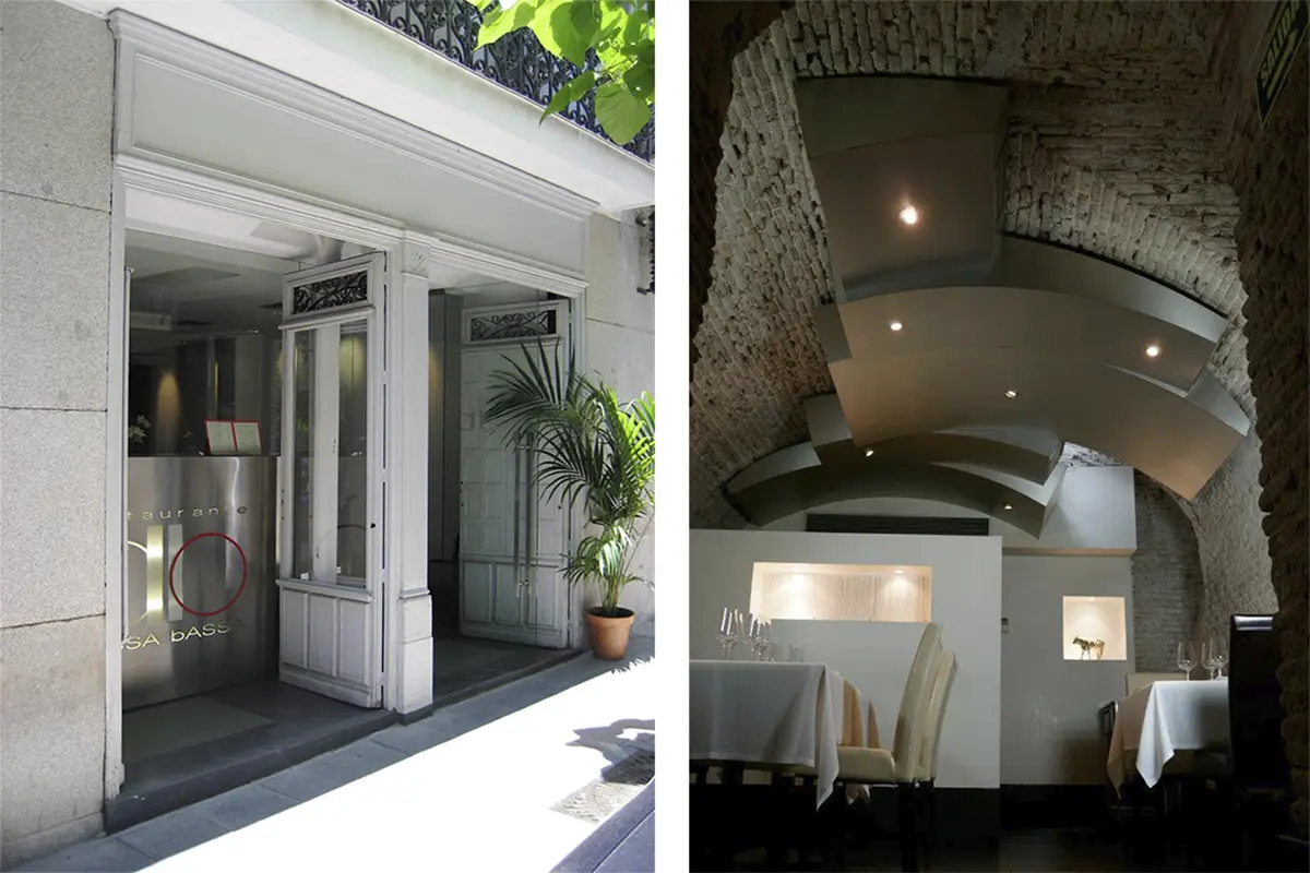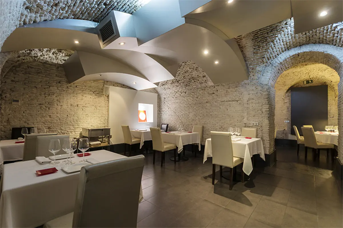 Mientras que en la planta sótano el proyecto arquitectónico es acorde con la personalidad interior y equilibrada del cocinero. Sencillo, sin ornamentaciones, que lo necesario sea potente pero útil, práctico, no queremos más que lo necesario. Se aprovecha el juego de las bóvedas de ladrillo existentes y de sus espacios compartimentados para resaltar un marcado carácter personalista e intimista.