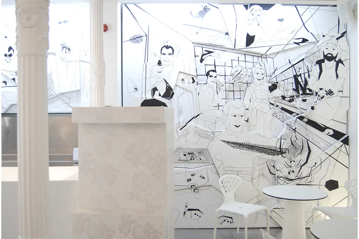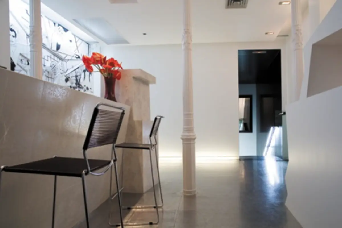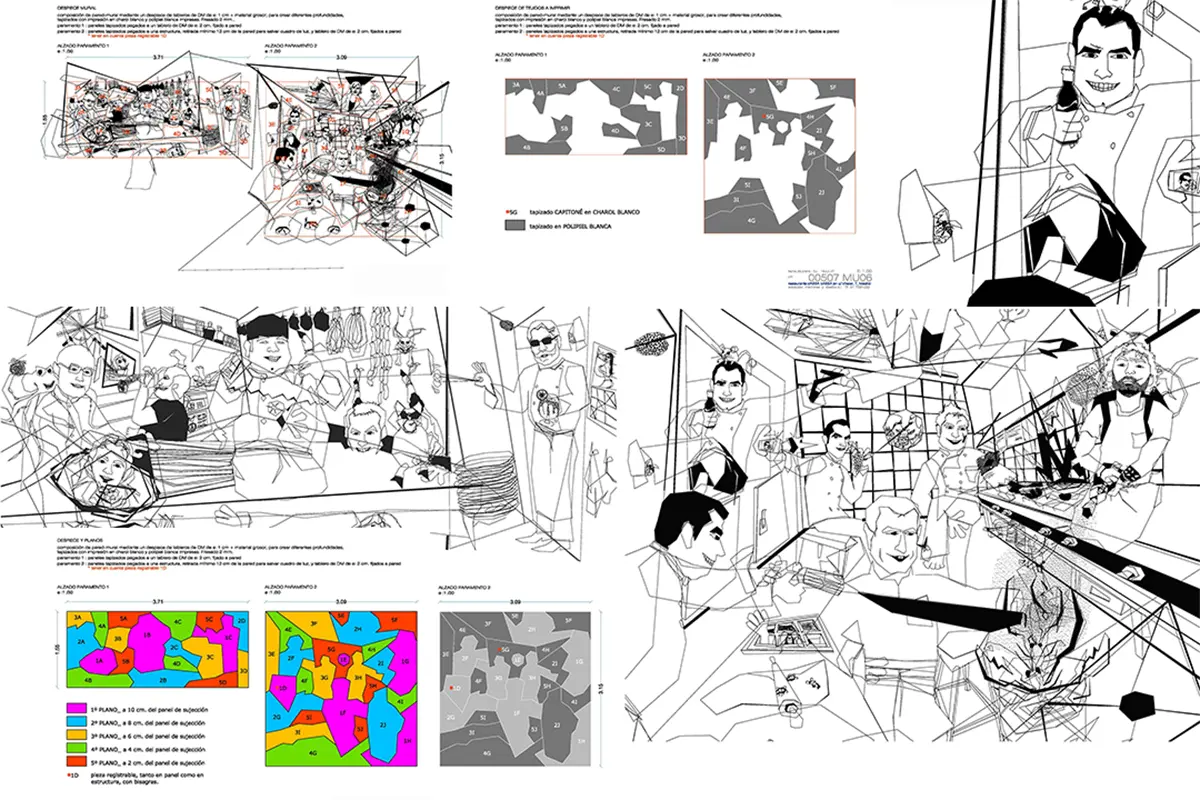 Aprovechando la singularidad del local, de 454 m2 de superficie total, el Proyecto arquitectónico que se plantea pretende la distinción entre las dos plantas con que cuenta: La planta baja se concibe como el escaparate, o la presencia exterior de la actuación. Suelo realizado con grandes planchas de aluminio. Una barra enmarcada por un mural impreso en charol en el que está representado Darío y sus amigos cocineros refleja la imagen exterior de Darío Barrio, lo que la gente ve; amistad, generosidad, carisma, dinamismo, humor, belleza. Es el arte de recibir.